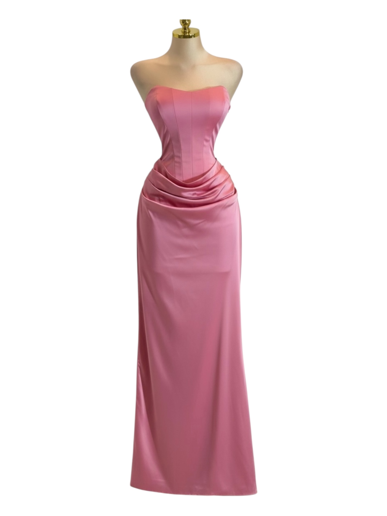 VESTIDO: LARGO ROSA TIPO CORSET CON FALDA RECTA Y DETALLE DRAPEADO