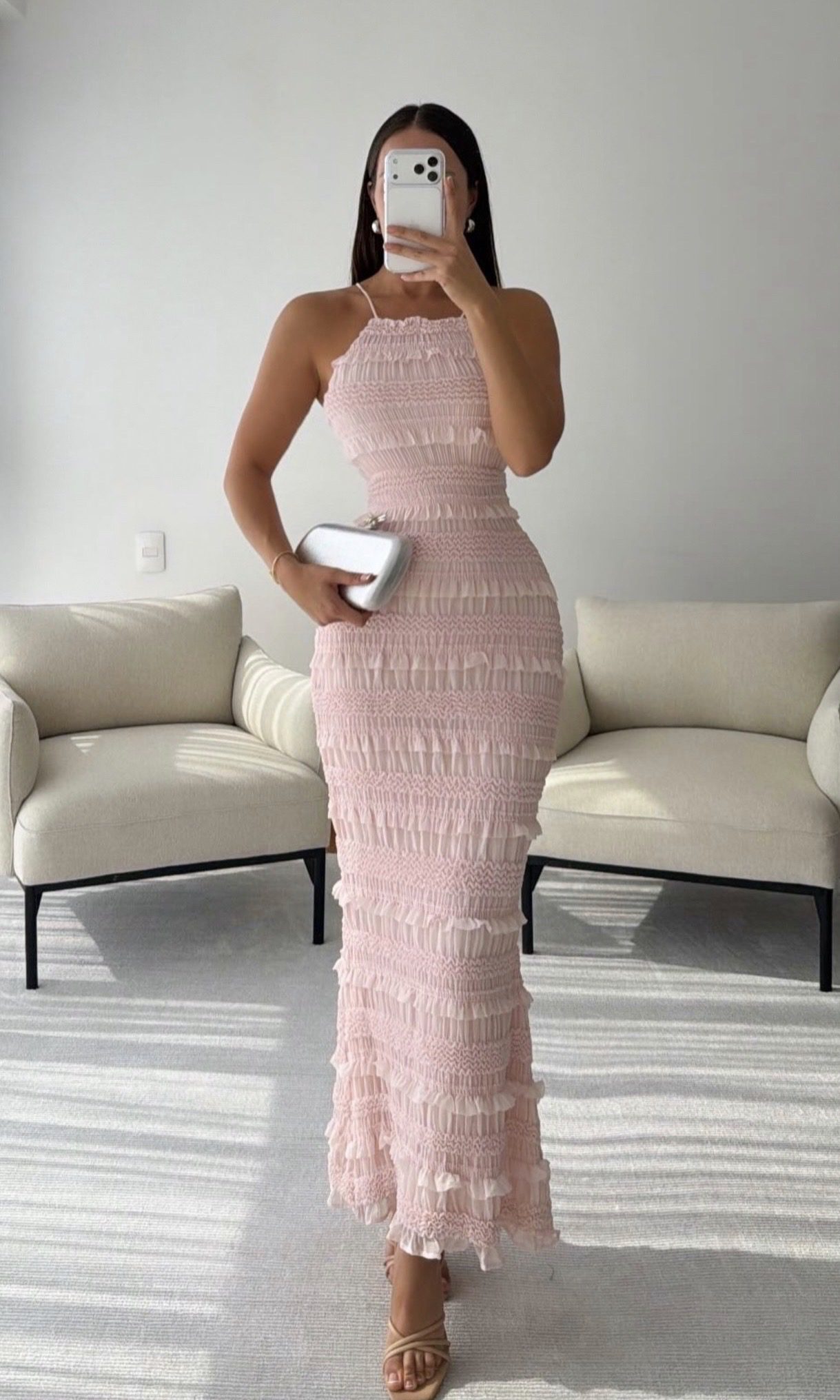 Vestido largo en tono rosa con diseño femenino y delicado. Presenta escote recto con tirantes delgados y ajuste tipo halter suave, que realza la parte superior de forma elegante. Confeccionado en tejido con fruncido elástico en todo el cuerpo, se adapta cómodamente a la silueta, definiendo la cintura y estilizando la figura. El diseño incorpora sutiles volantes horizontales que aportan textura, movimiento y un acabado romántico. Falda larga de caída fluida con ligero vuelo en el bajo. Ideal para eventos de día, bodas al aire libre, celebraciones especiales y ocasiones donde se busca un look fresco, femenino y sofisticado.
