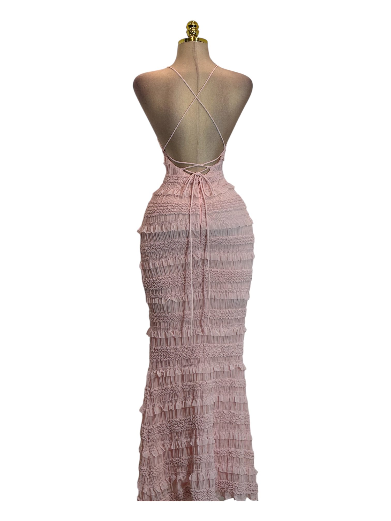VESTIDO: LARGO COLOR ROSA CON TIRANTES Y TEXTURA FRUNCIDA