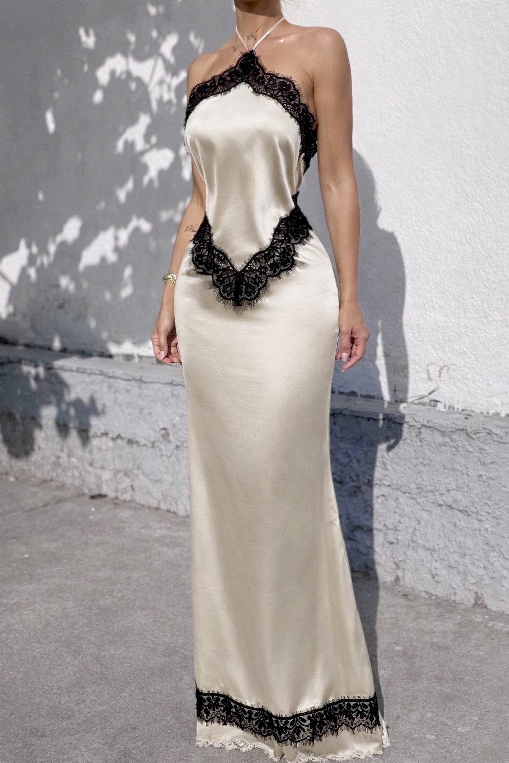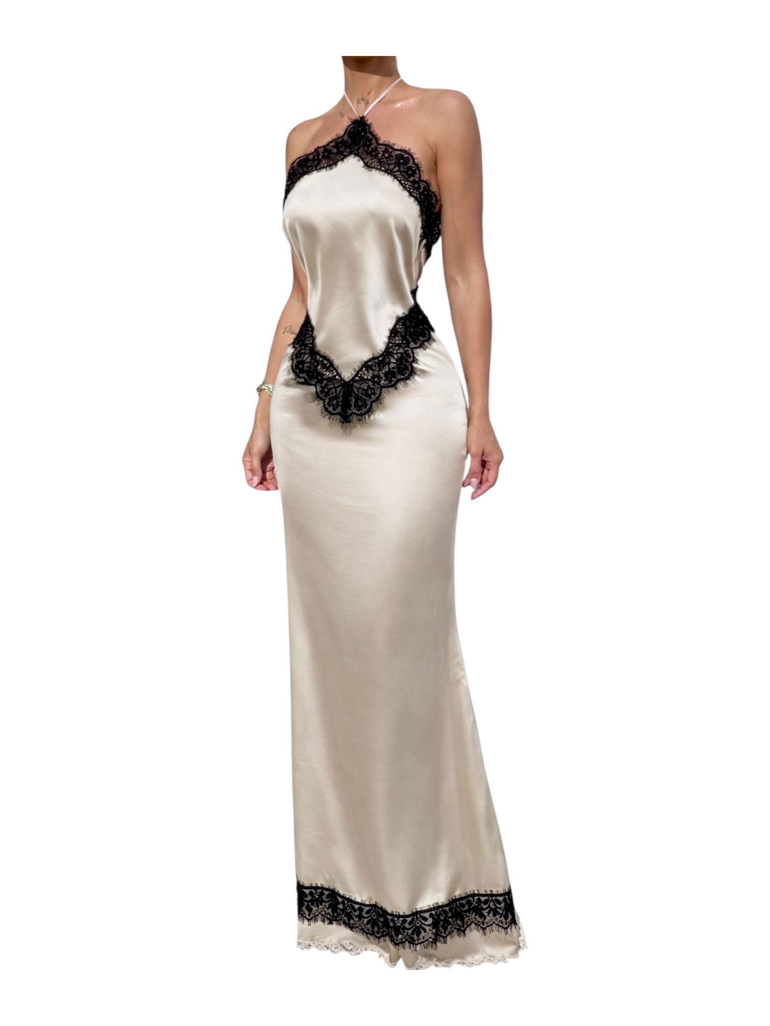 Vestido Satinado Champagne Con Encaje Negro