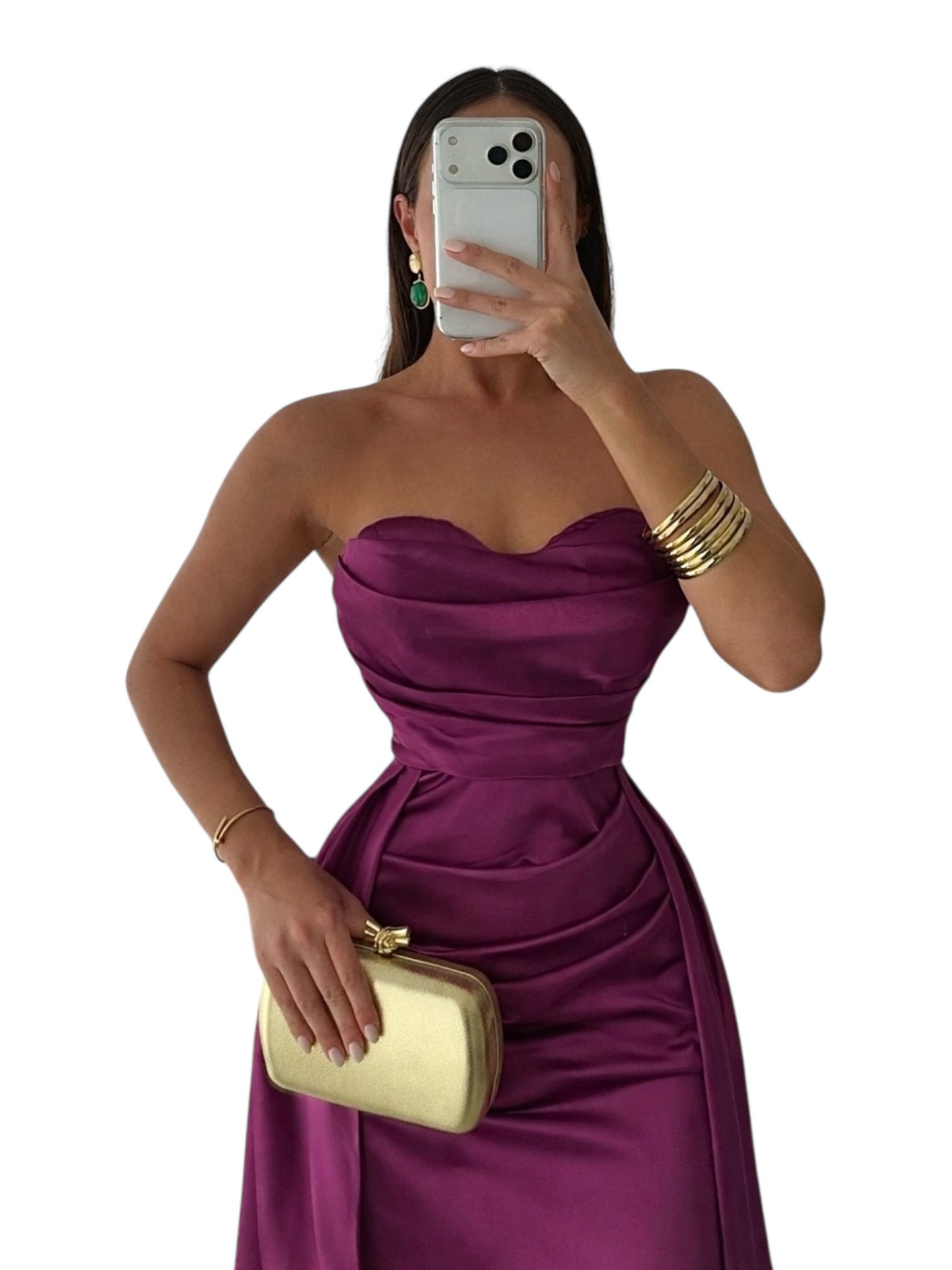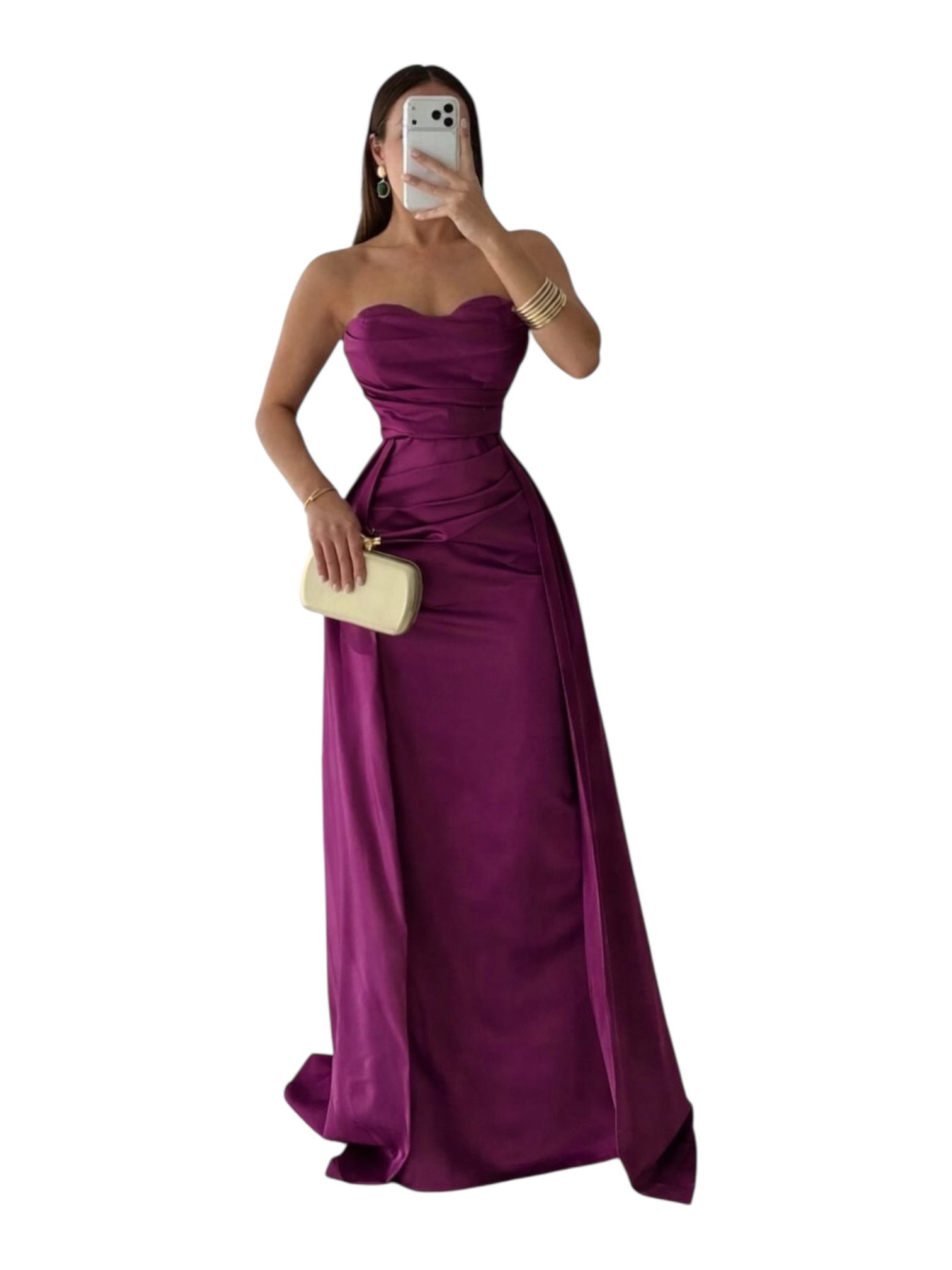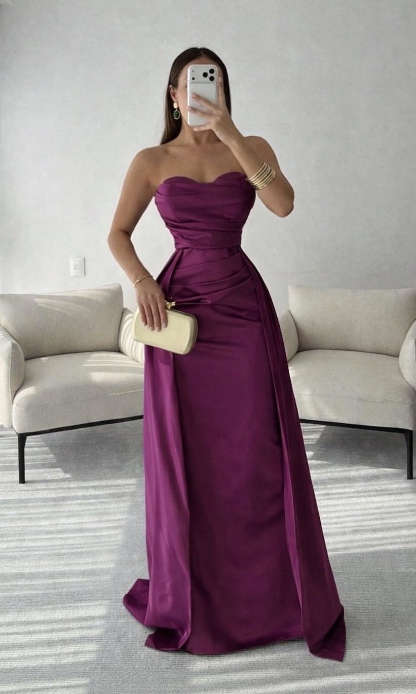 Vestido largo en tono ciruela con acabado satinado y escote strapless tipo corazón. Diseño ajustado en la cintura con delicado drapeado que estiliza la figura y falda larga de caída elegante. Ideal para eventos formales, galas o celebraciones especiales.
