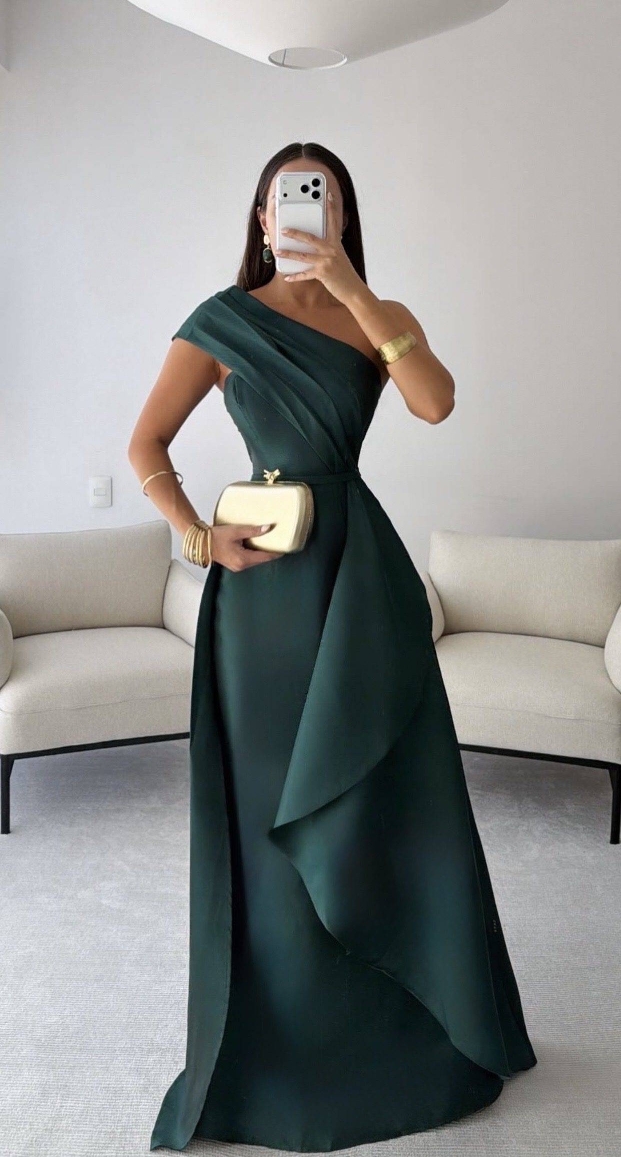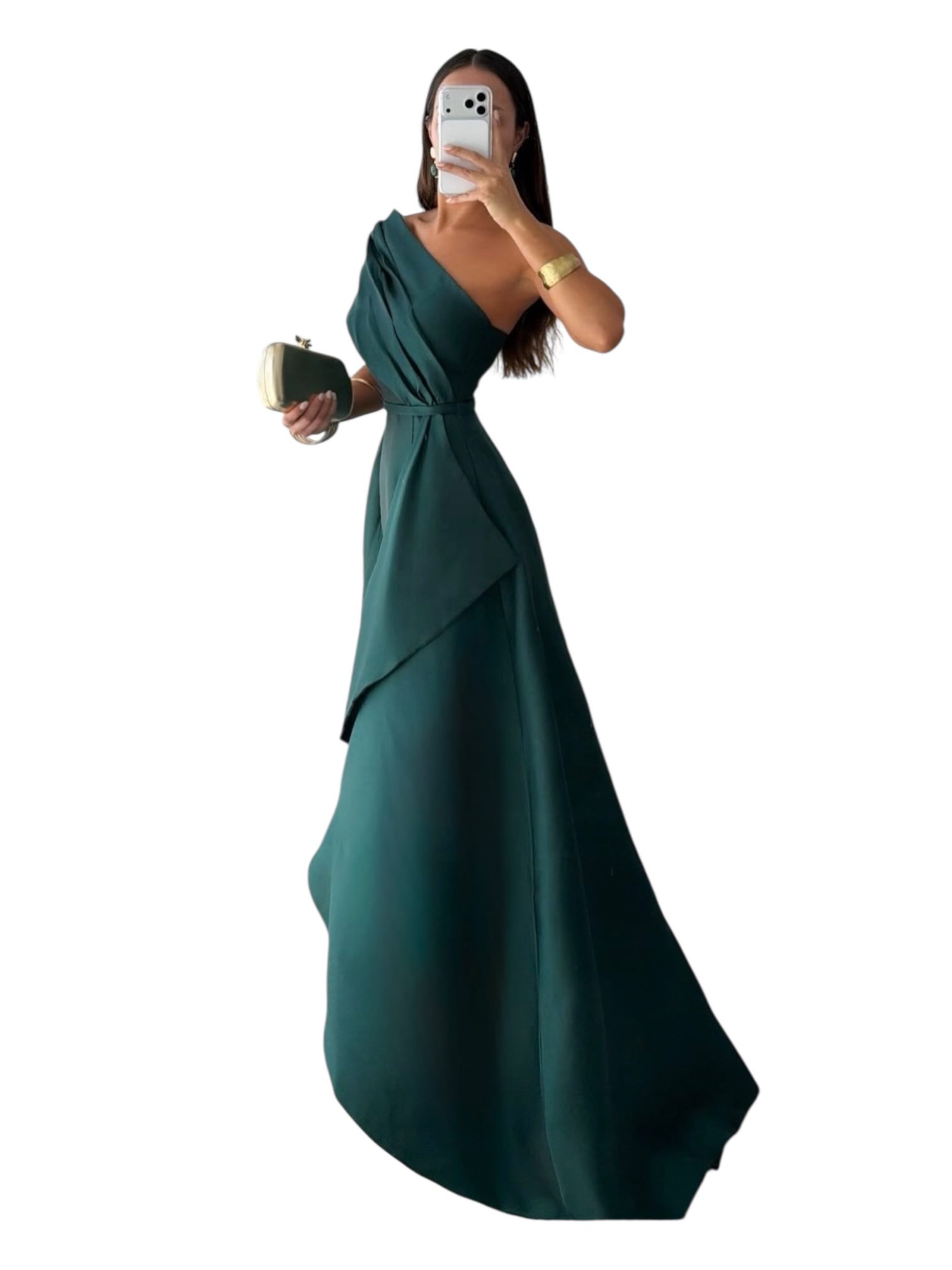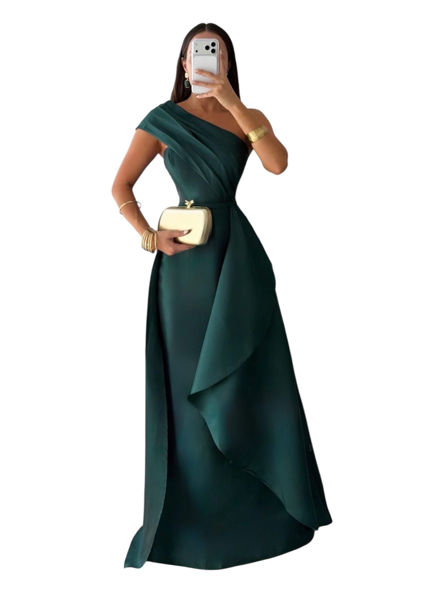 Vestido largo en tono verde con diseño de un solo hombro y drapeado en la parte superior. Corte amplio con caída fluida y detalle de capa frontal que aporta movimiento y elegancia. Ideal para bodas y eventos formales.