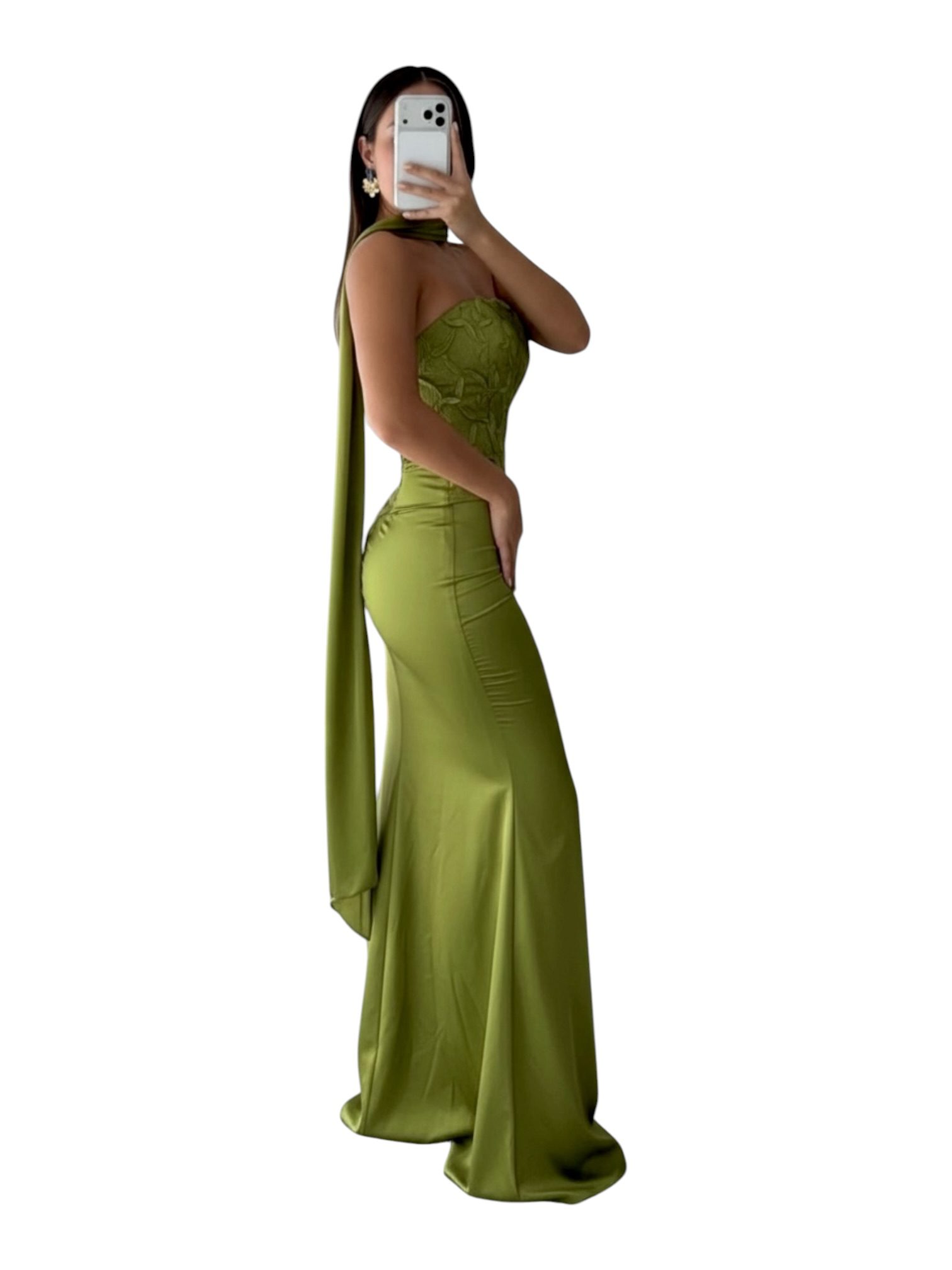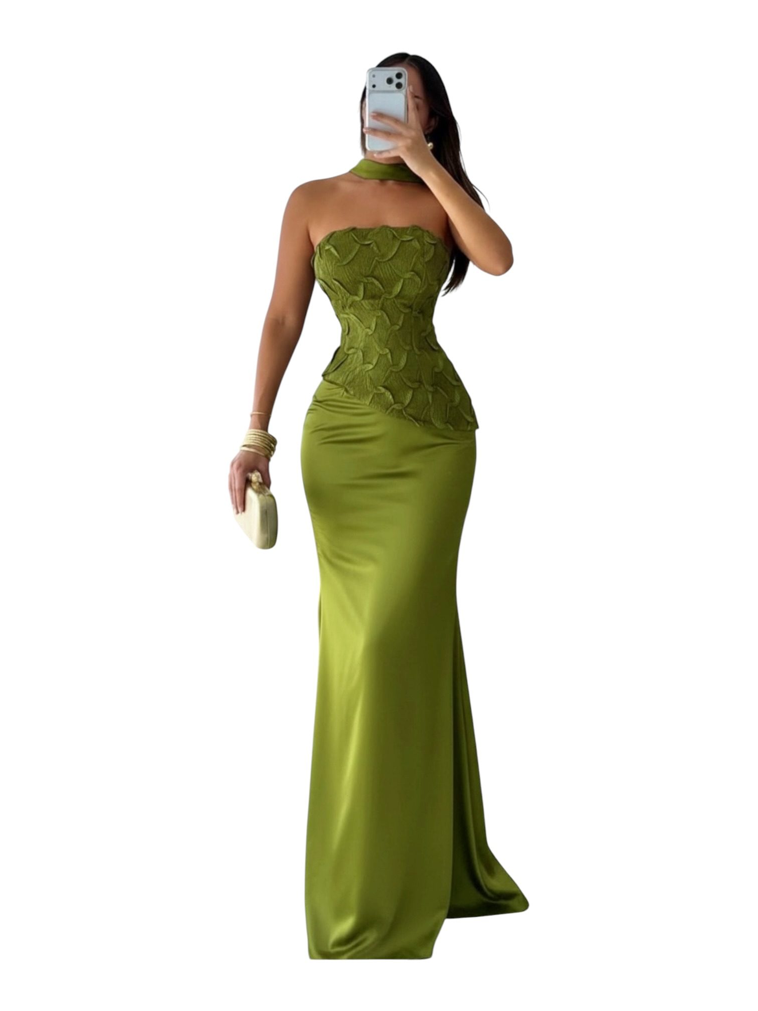 Vestido Verde Con Corset Texturizado Y Falda Satinada Ajustada