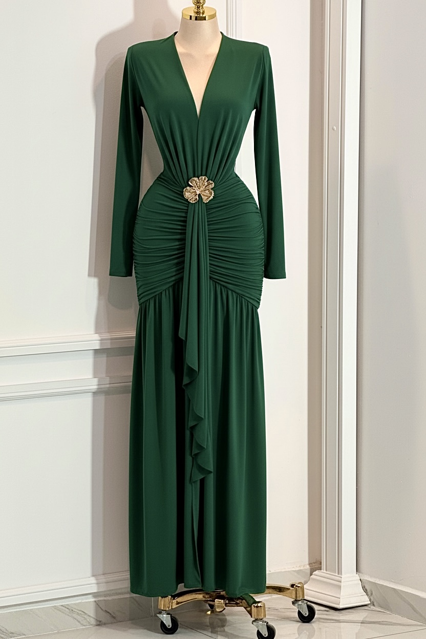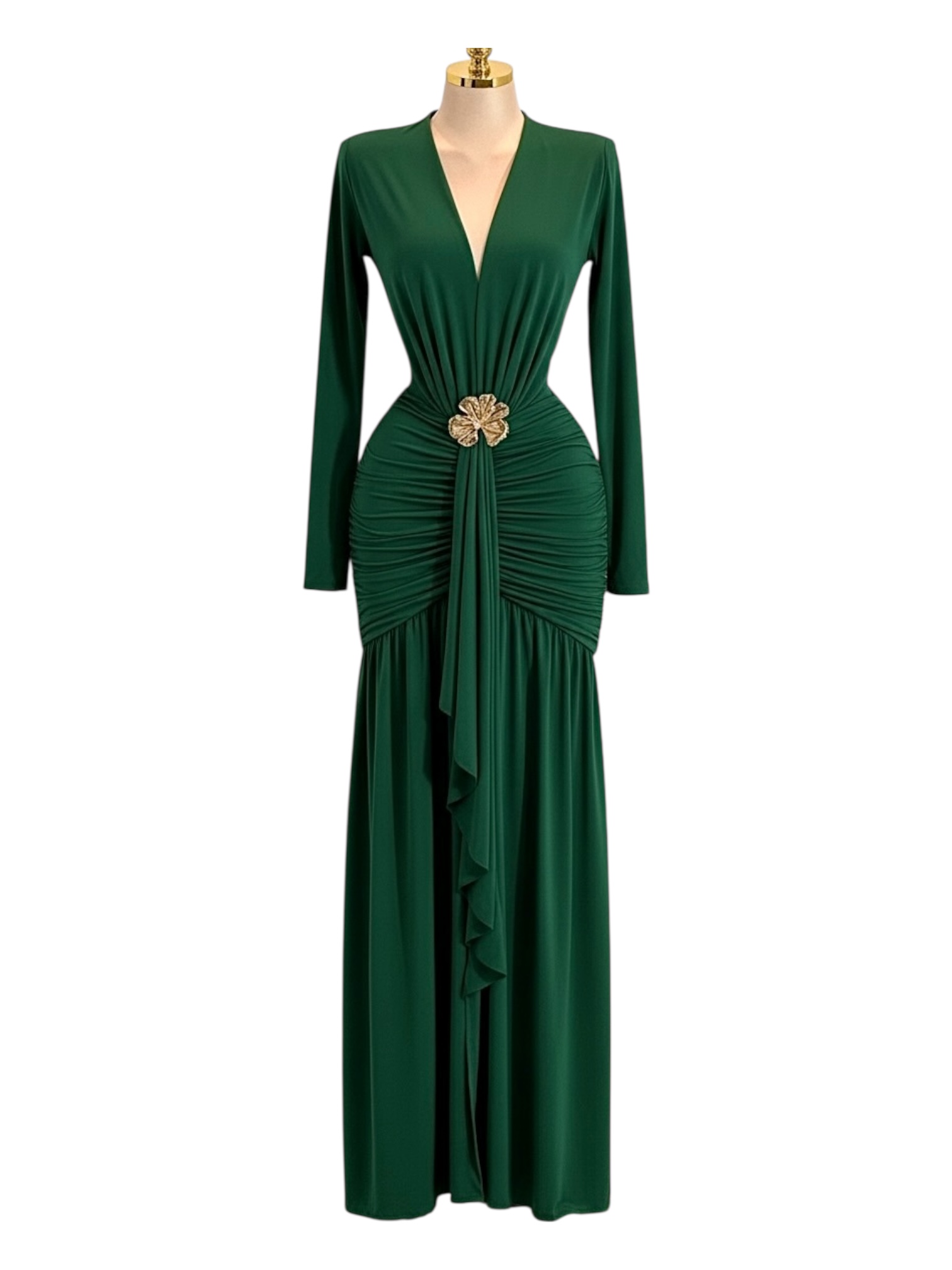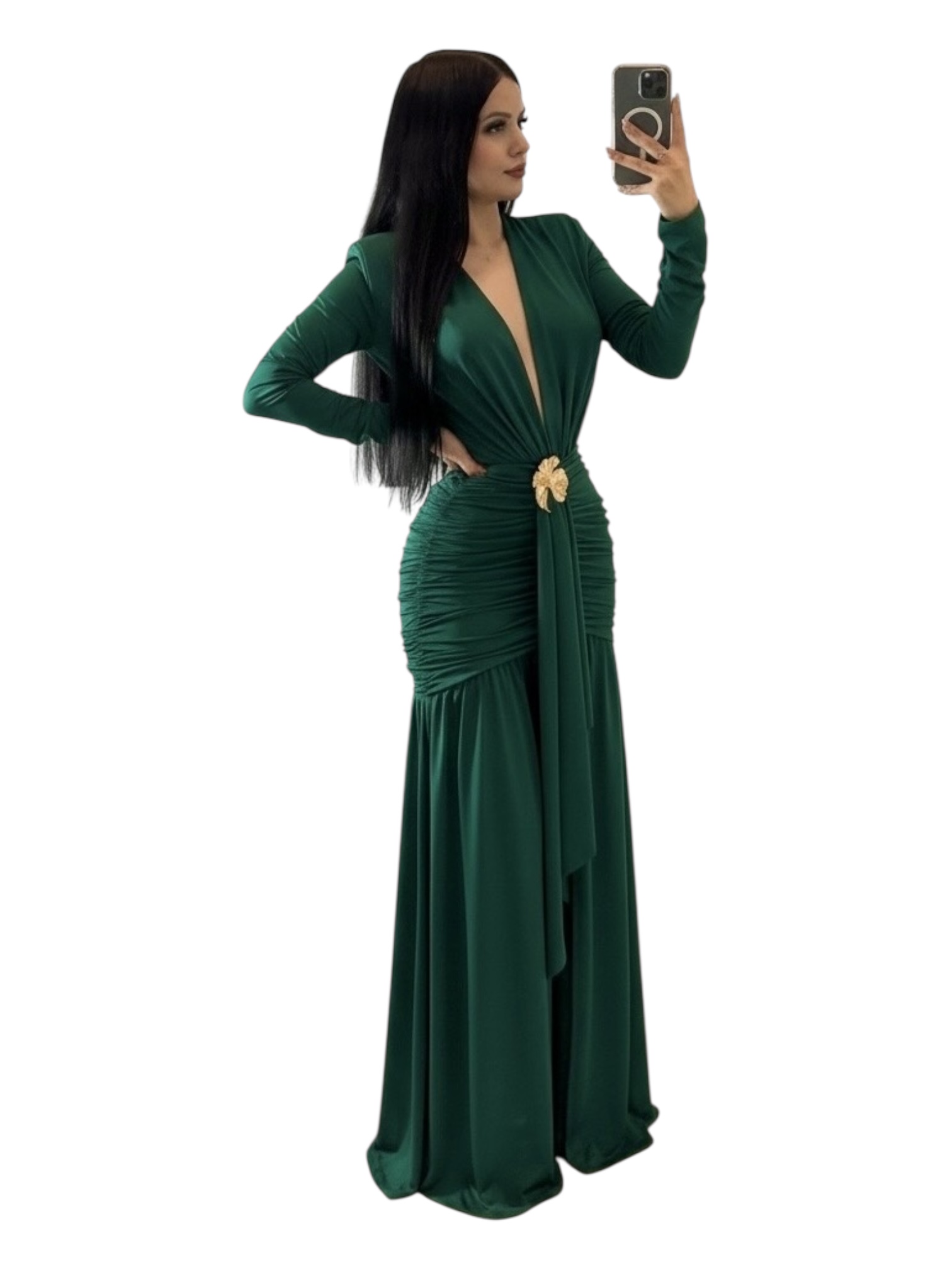 Vestido largo en tono verde con un diseño elegante y moderno que estiliza la figura con gran sofisticación. Presenta un escote profundo en V que realza la parte superior con un estilo sensual y refinado. El cuerpo entallado define la cintura con precisión, mientras que el frunce central acompañado de un broche dorado añade textura, movimiento y un toque glamuroso. La falda larga de caída fluida complementa el diseño con un acabado distinguido y femenino.