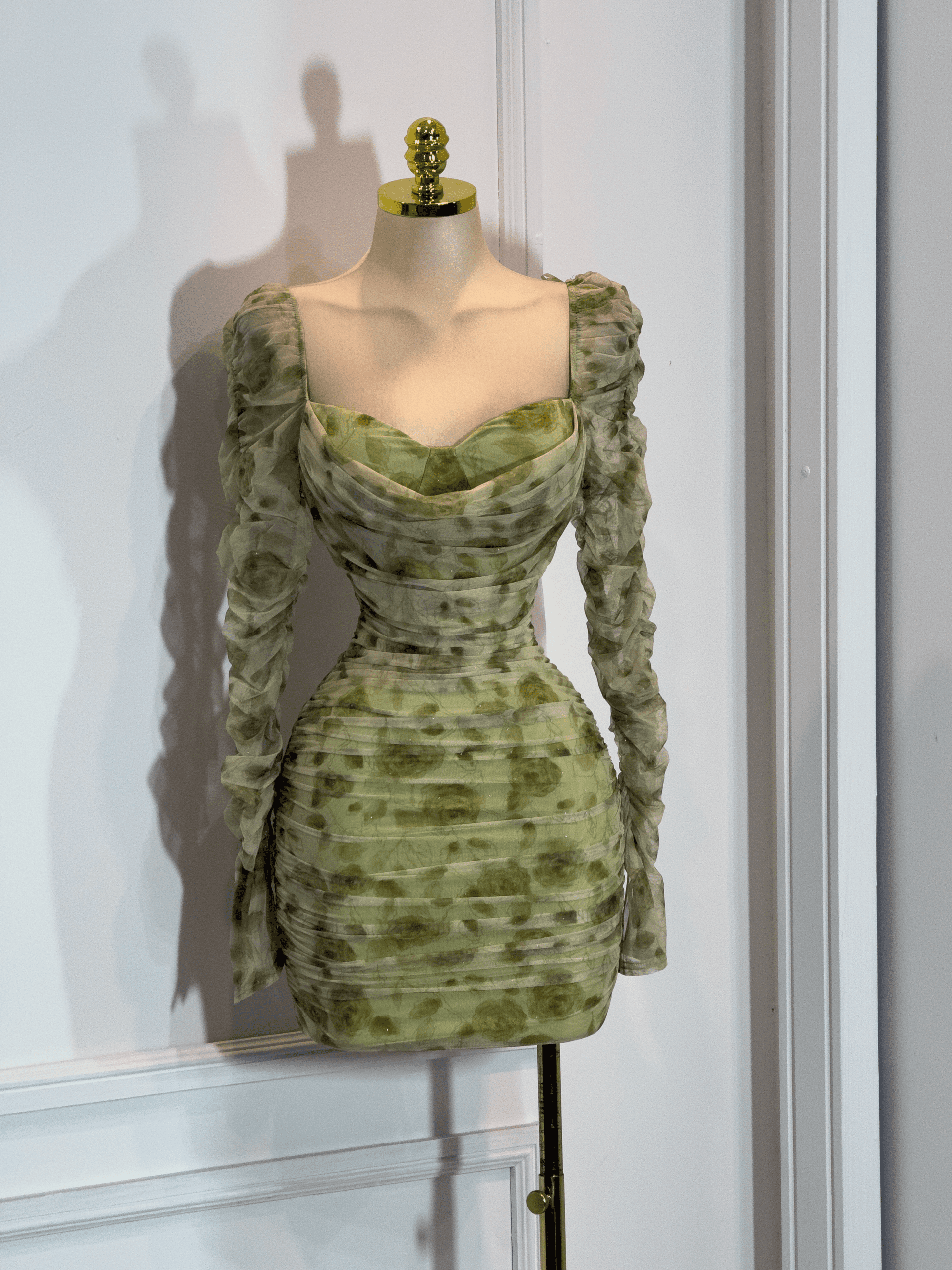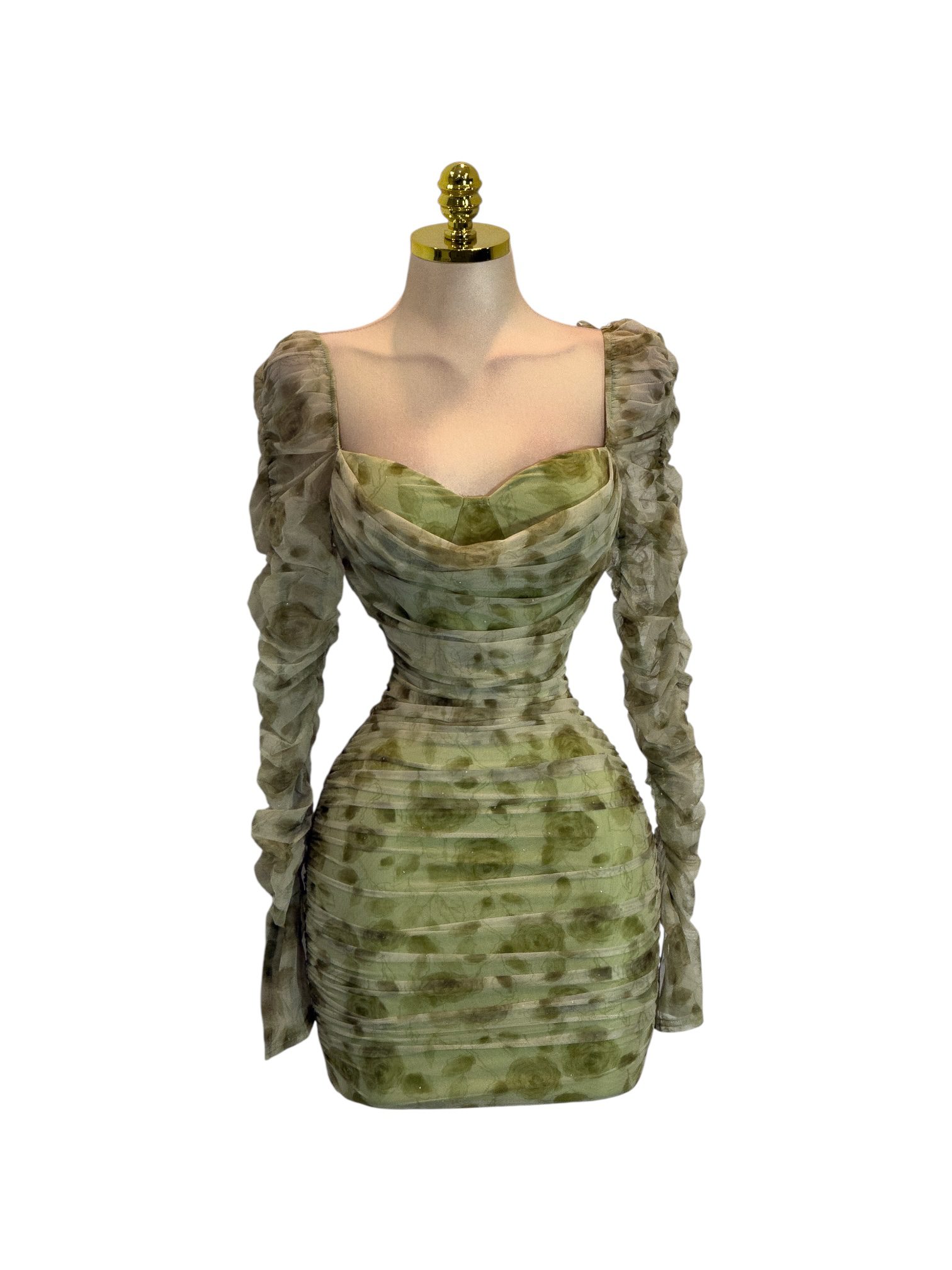Vestido corto en tono verde con estampado. Presenta escote corazón, mangas largas fruncidas y corte entallado que define la silueta. El fruncido en todo el cuerpo aporta un efecto estilizado y femenino. Ideal para fiestas, salidas nocturnas y ocasiones especiales.
