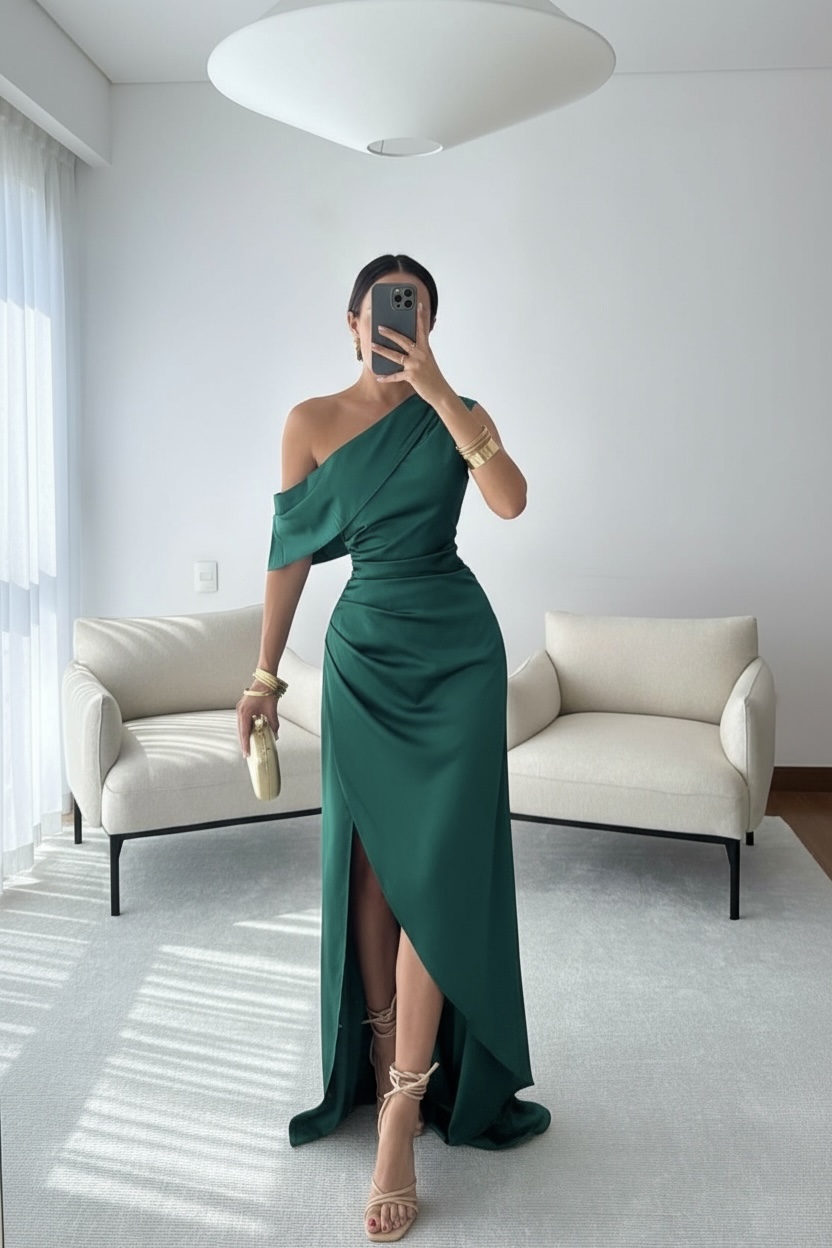Vestido largo en tono verde esmeralda de acabado fluido y elegante. Presenta diseño asimétrico de un solo hombro con drapeado que realza la silueta y aporta un toque sofisticado. La cintura entallada define la figura, mientras que la falda con abertura lateral ofrece movimiento y sensualidad. Ideal para galas, bodas o eventos formales donde busques un look distinguido, moderno y lleno de estilo.