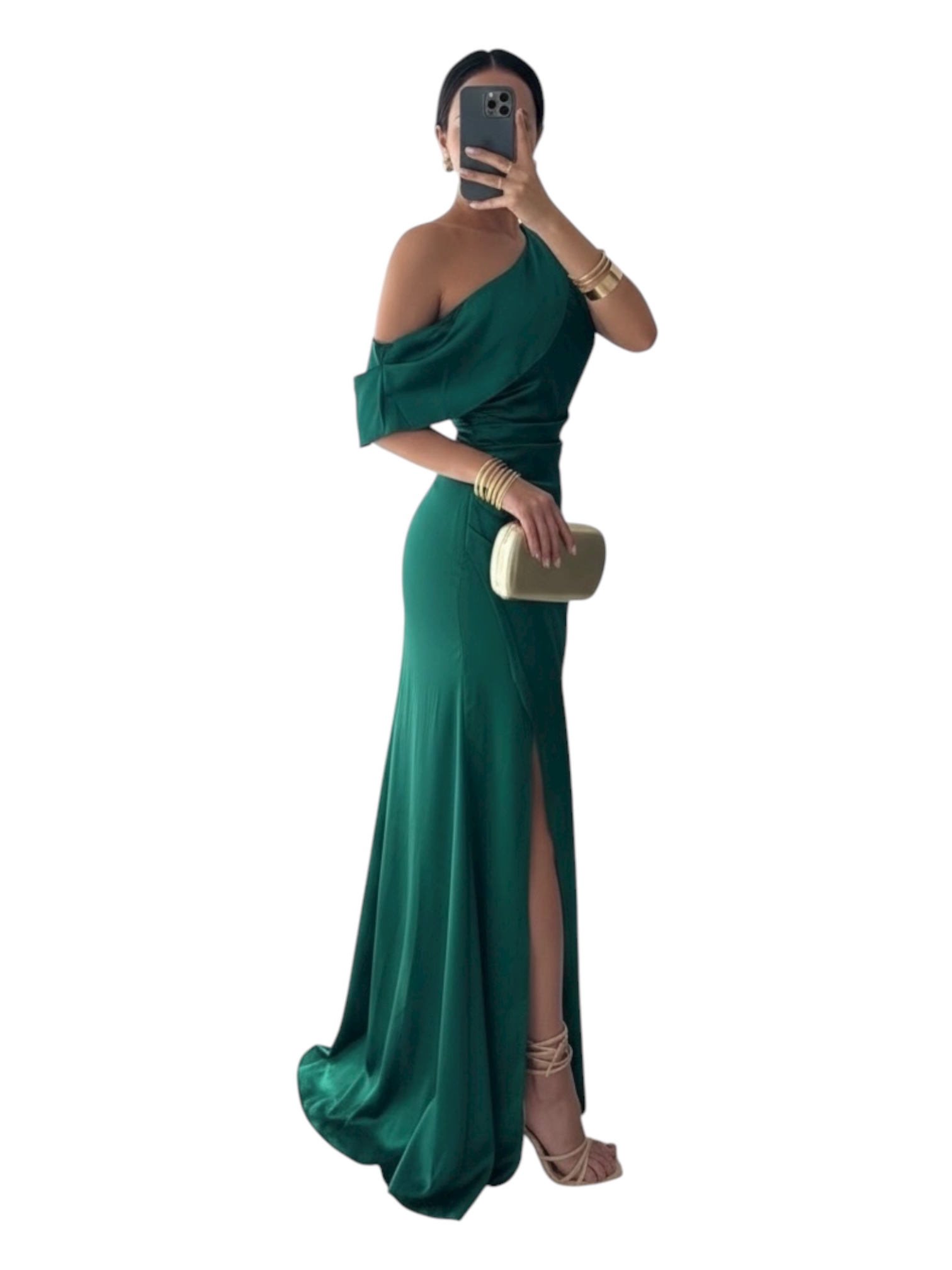 VESTIDO: LARGO VERDE ESMERALDA CON UN HOMBRO Y ABERTURA LATERAL