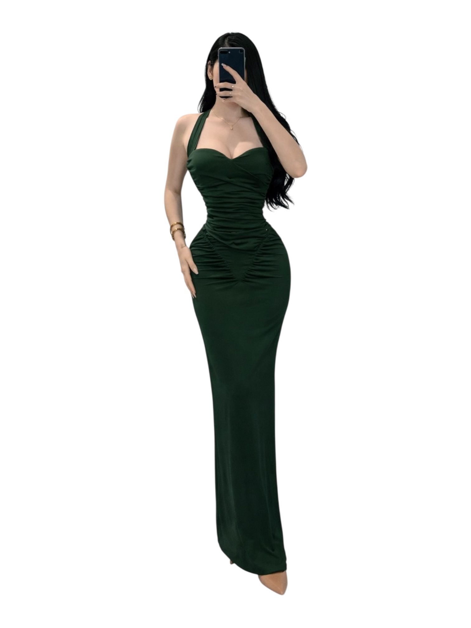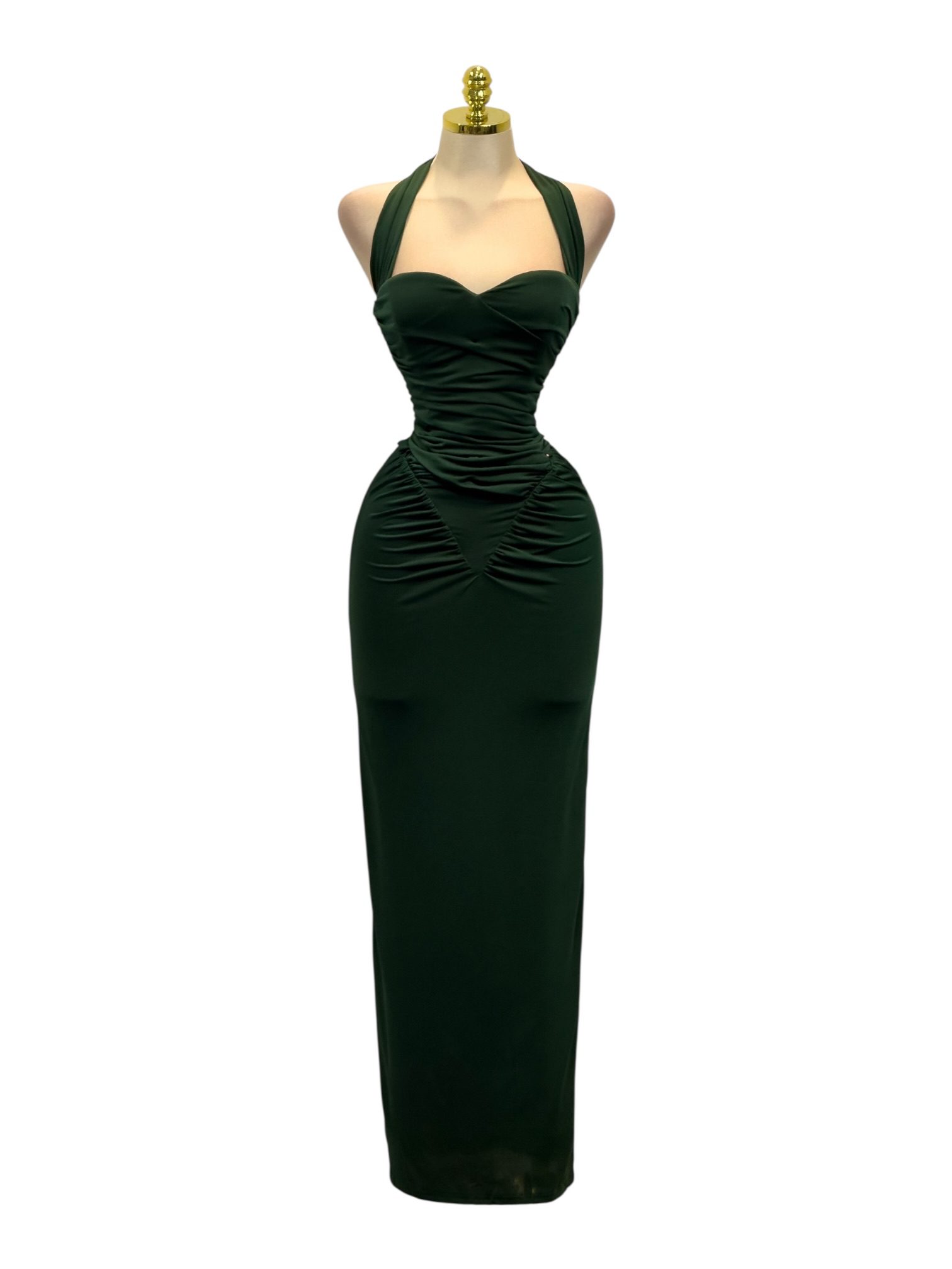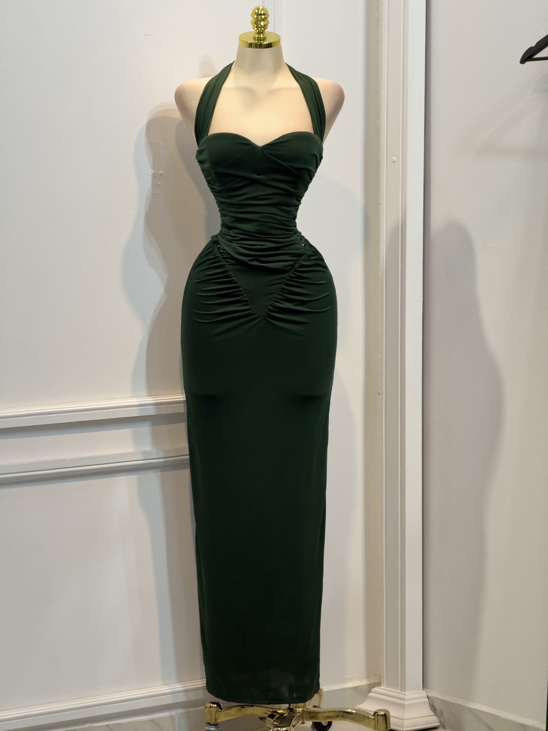Vestido midi en tono verde esmeralda con escote halter y corte ajustado que define la silueta. Diseño con drapeado estratégico en busto y cadera para un efecto estilizado y elegante. Ideal para eventos formales o salidas de noche.