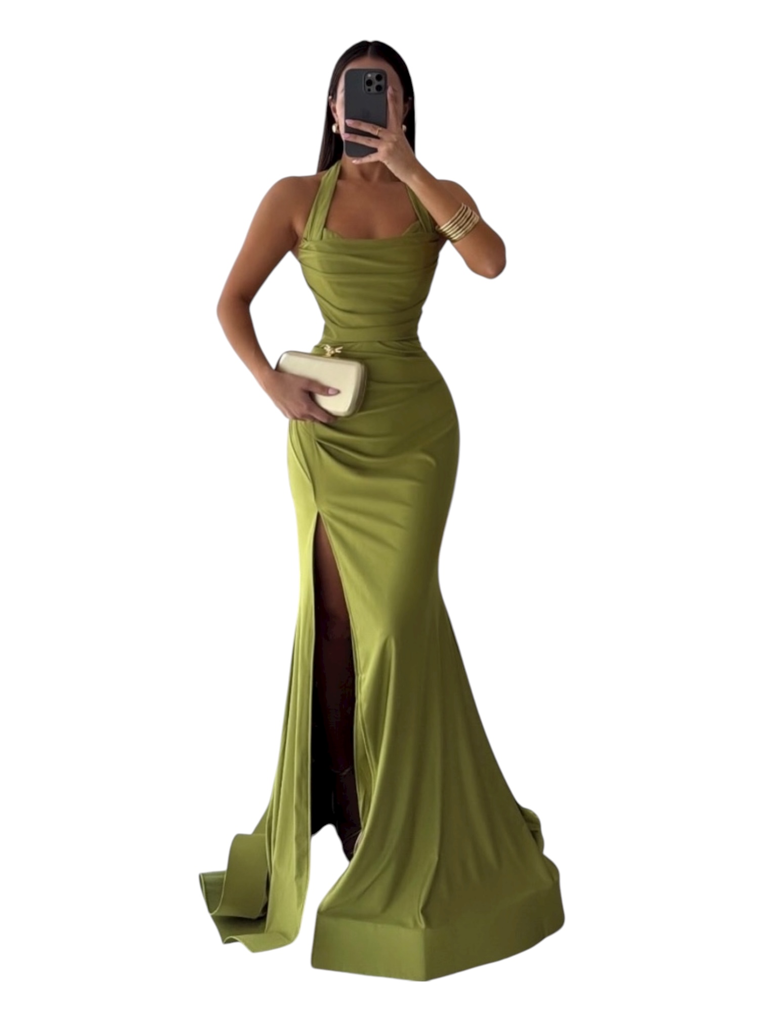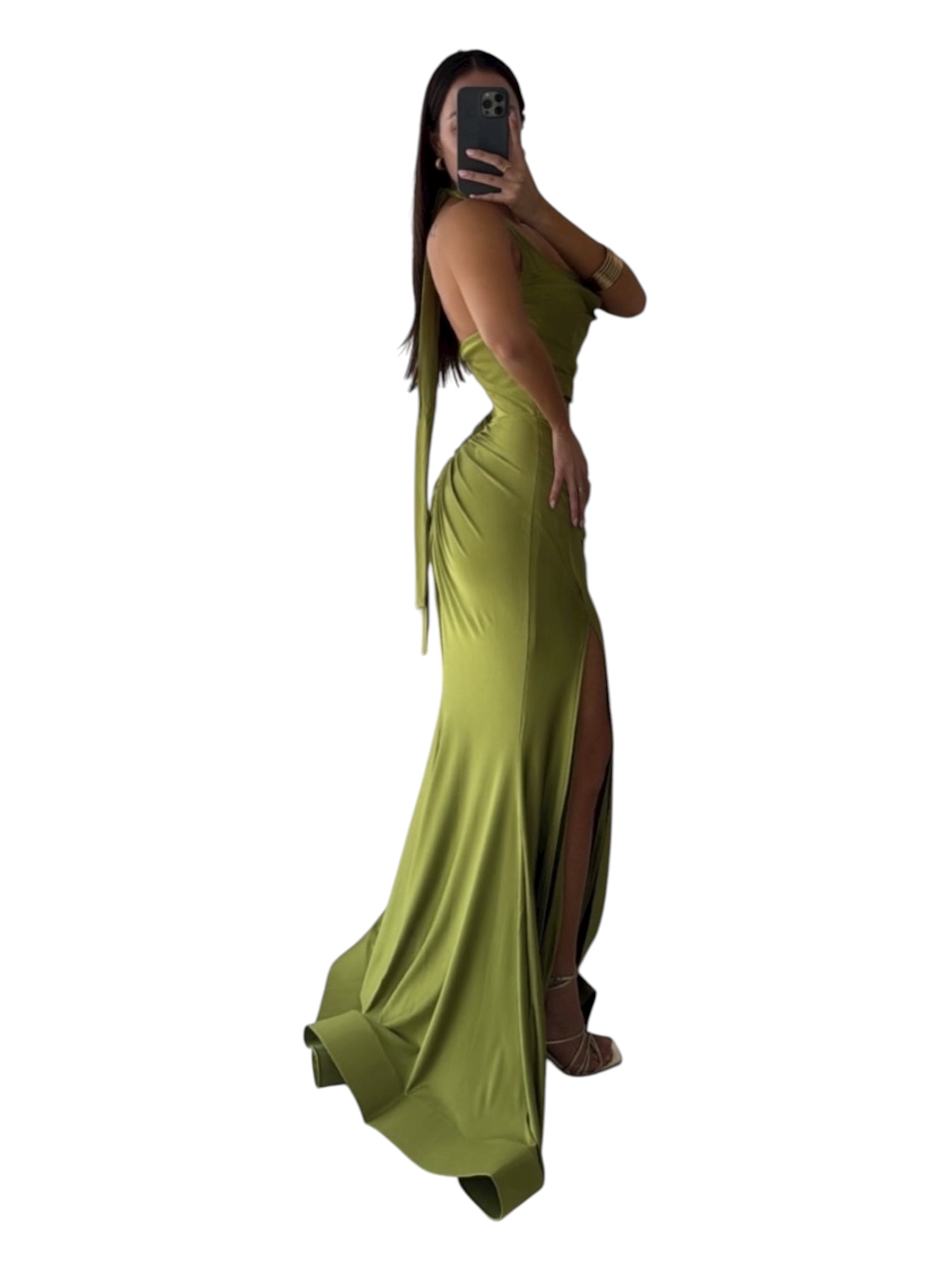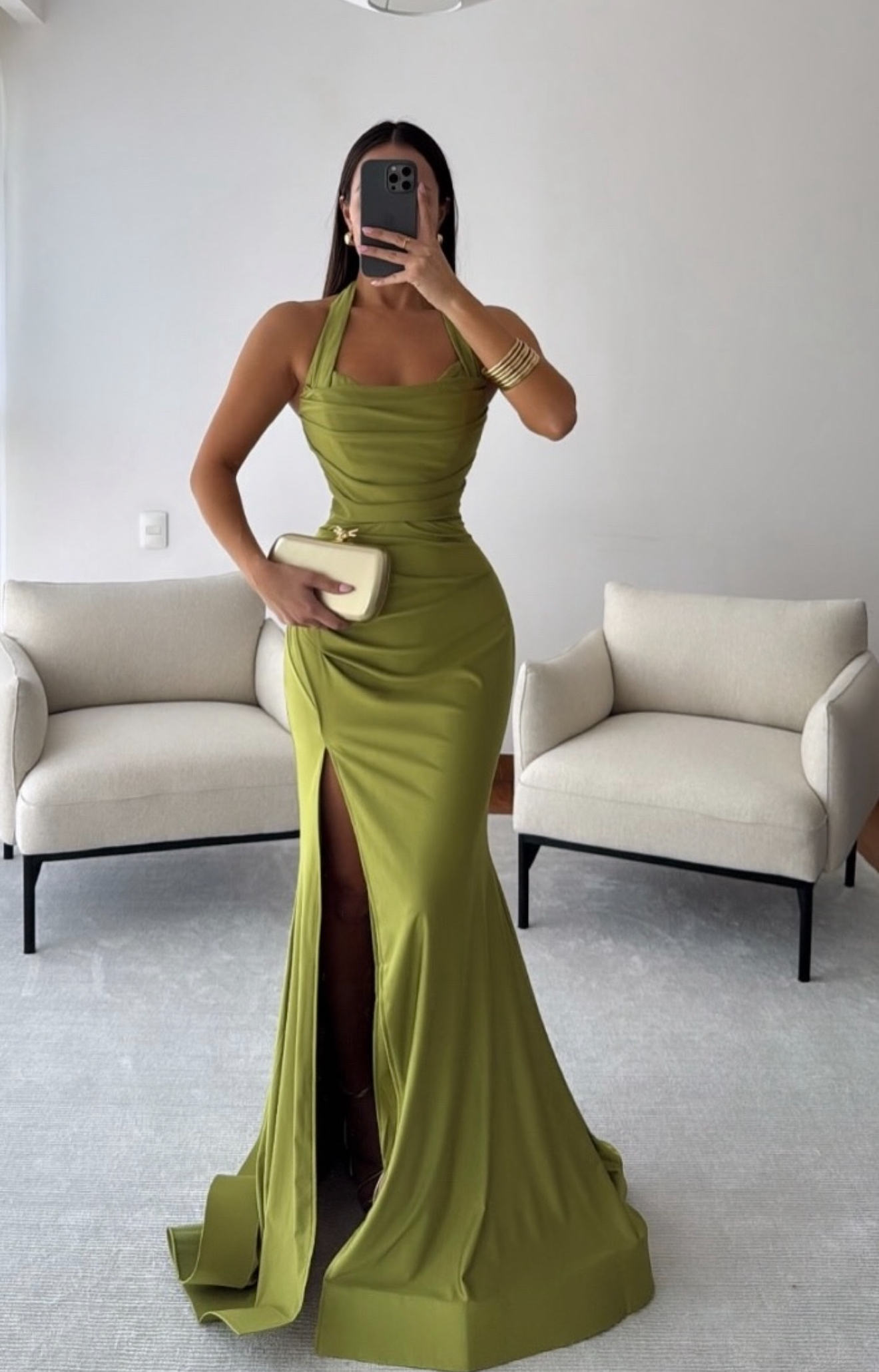 Vestido largo en tono verde lima con escote drapeado que aporta un aire sofisticado y elegante. Su silueta entallada realza las curvas, mientras la abertura frontal en la falda añade un toque sensual y moderno. La caída fluida del tejido equilibra el diseño, creando un look refinado y glamuroso. Ideal para galas, recepciones o eventos de noche donde quieras destacar con distinción.
