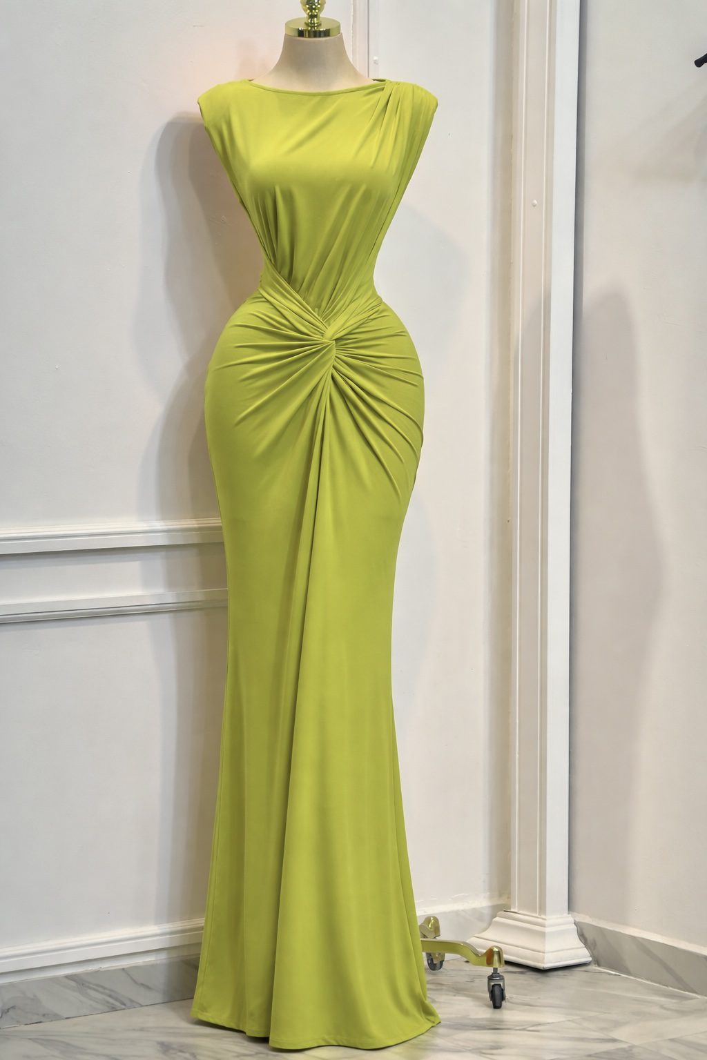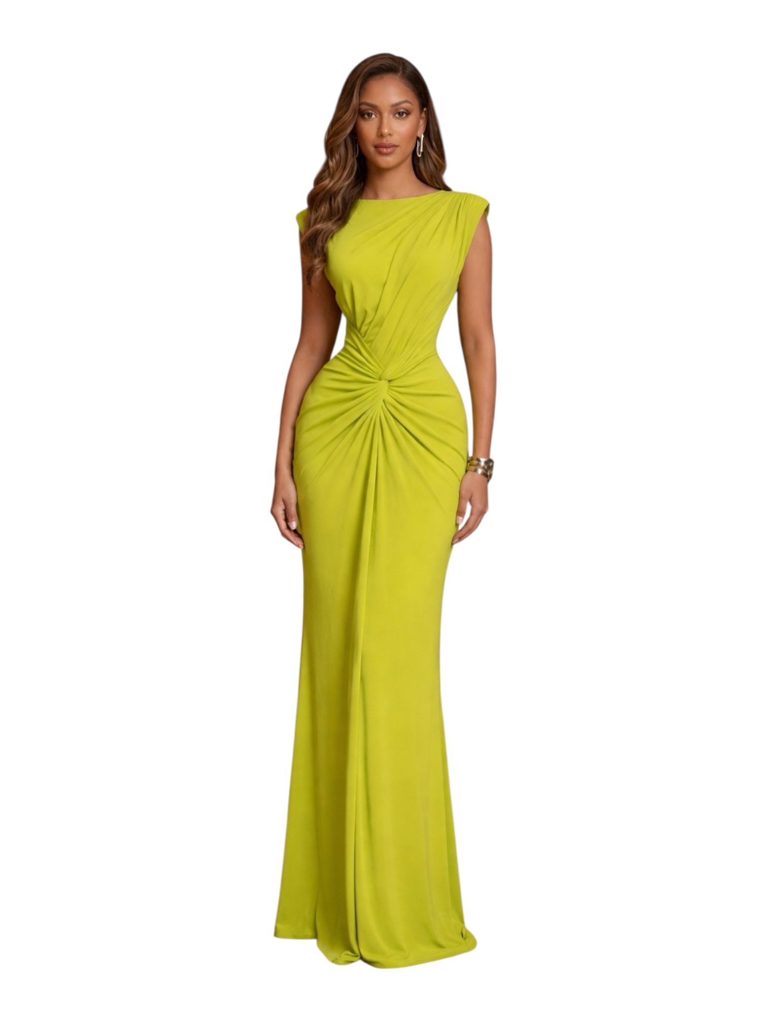 Vestido largo en tono verde lima con diseño elegante y minimalista. Cuenta con escote cerrado y detalle de drapeado central tipo nudo que estiliza la silueta. Corte ajustado con caída fluida que aporta sofisticación. Ideal para eventos de noche o looks llamativos.