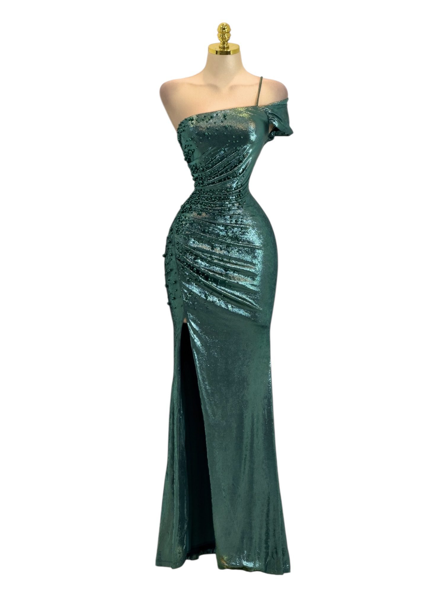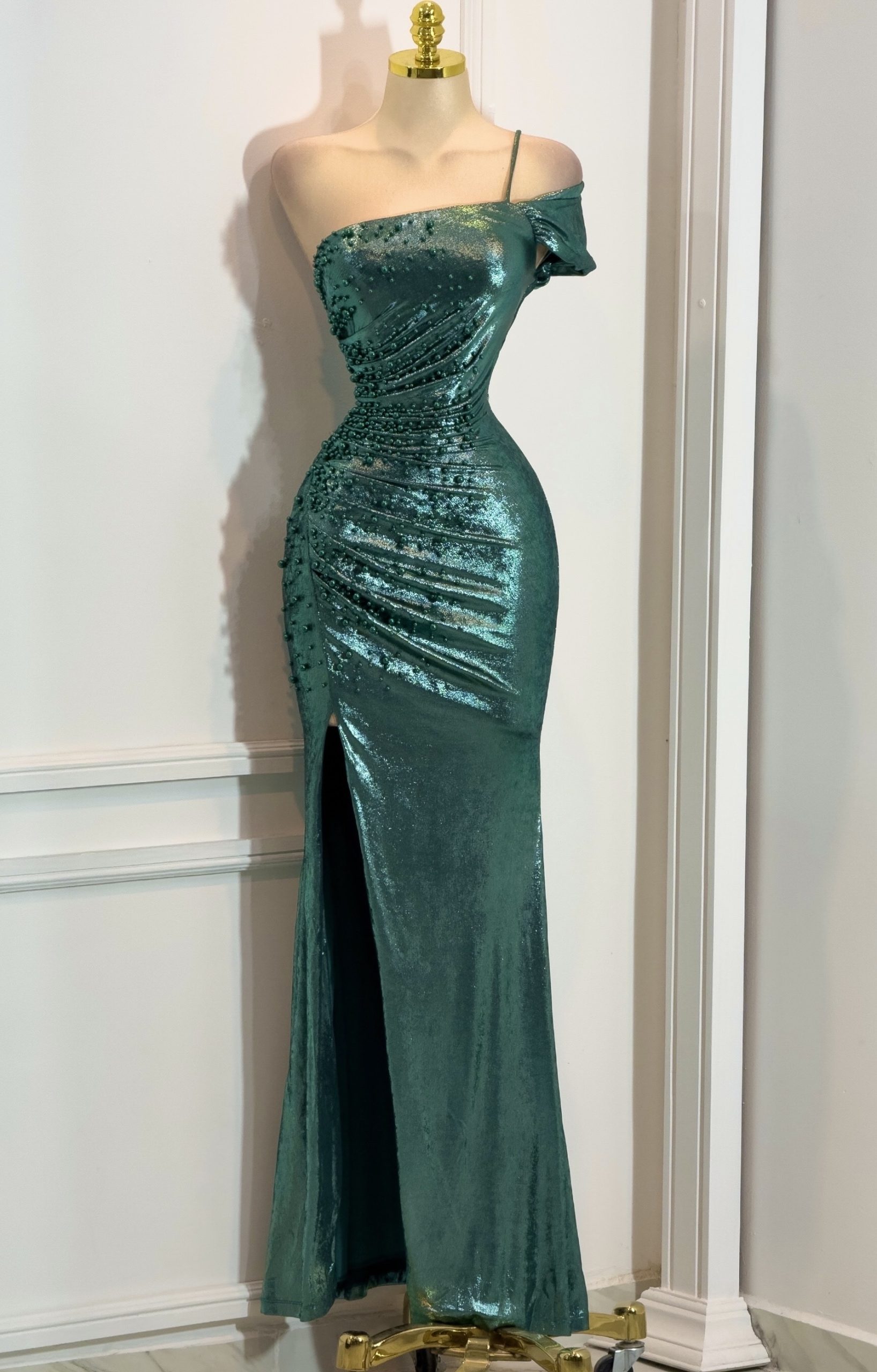 Vestido Verde Metálico Con Un Hombro Y Abertura Lateral