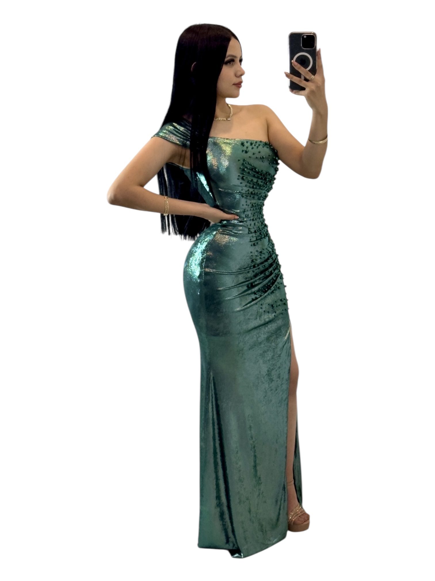 Vestido largo en tono verde metalico con acabado brillante que aporta un efecto luminoso y glamoroso. Presenta un diseño asimétrico con un tirante delgado y un hombro caído, creando un look moderno y sofisticado. El cuerpo entallado incluye frunces estratégicos que realzan la silueta y aportan textura. La falda larga incorpora una abertura frontal que añade movimiento y un toque sensual. Una pieza elegante, llamativa y de alto impacto visual, ideal para galas, eventos nocturnos o celebraciones donde busques destacar con un estilo refinado y deslumbrante.