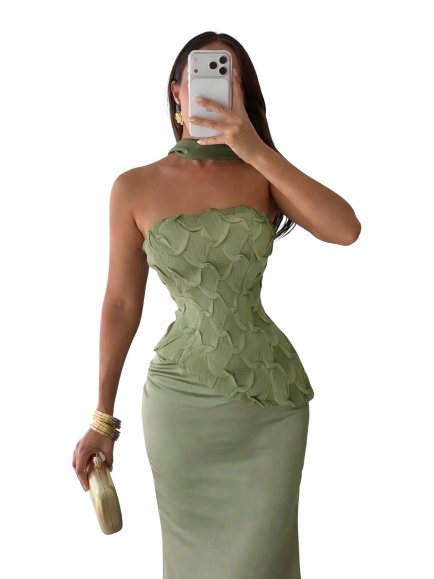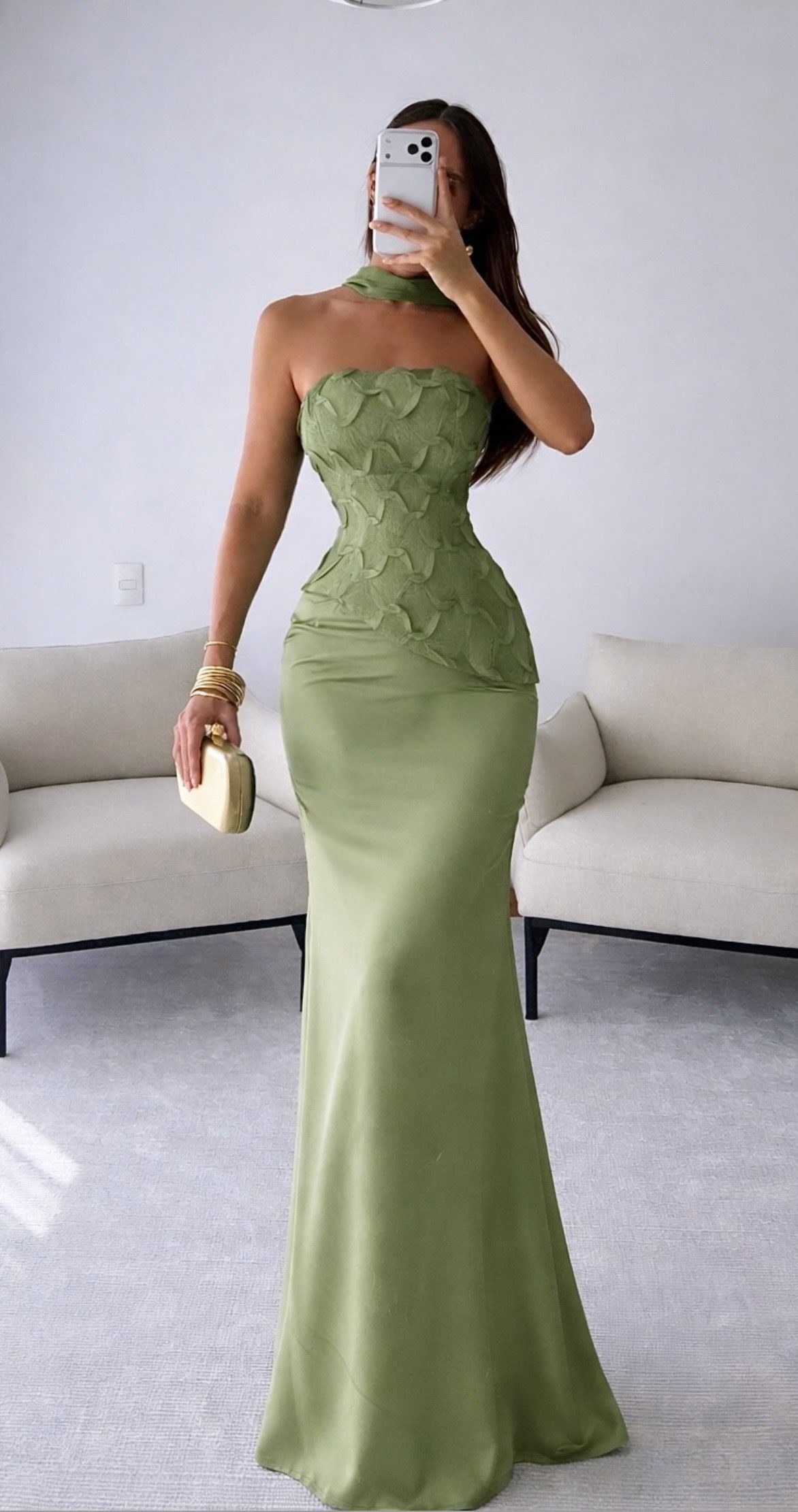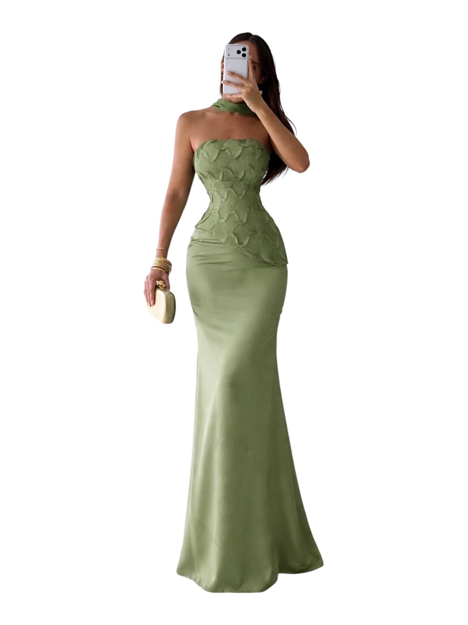 Vestido largo en tono verde oliva con escote strapless y detalle de cuello tipo halter. Corset estructurado con aplicaciones en relieve que estiliza la silueta. Falda de caída suave con acabado satinado. Ideal para eventos formales o de noche.