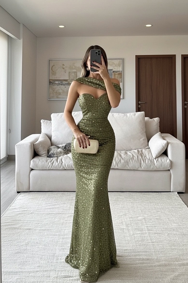 Vestido largo en tono verde olivo con acabado brillante gracias a sus lentejuelas que aportan un efecto glamuroso y sofisticado. Presenta un escote bardot asimétrico que enmarca los hombros con un diseño moderno y sensual, acompañado de una copa tipo corazón que realza el busto con elegancia. El cuerpo entallado define la silueta con firmeza, estilizando la cintura y resaltando las curvas. La falda de corte sirena se ajusta suavemente hasta la rodilla y se abre hacia el bajo, creando un movimiento fluido y refinado.