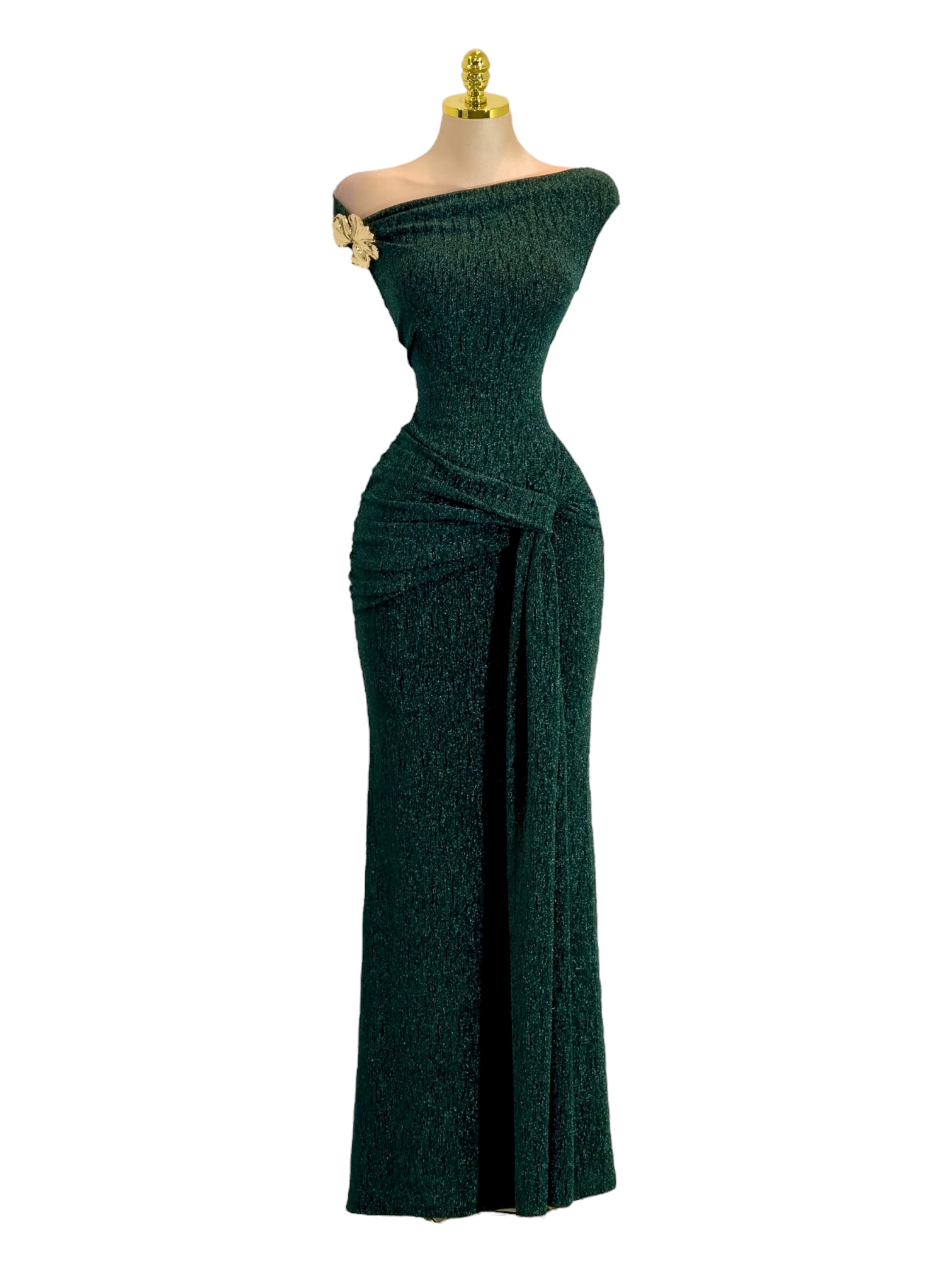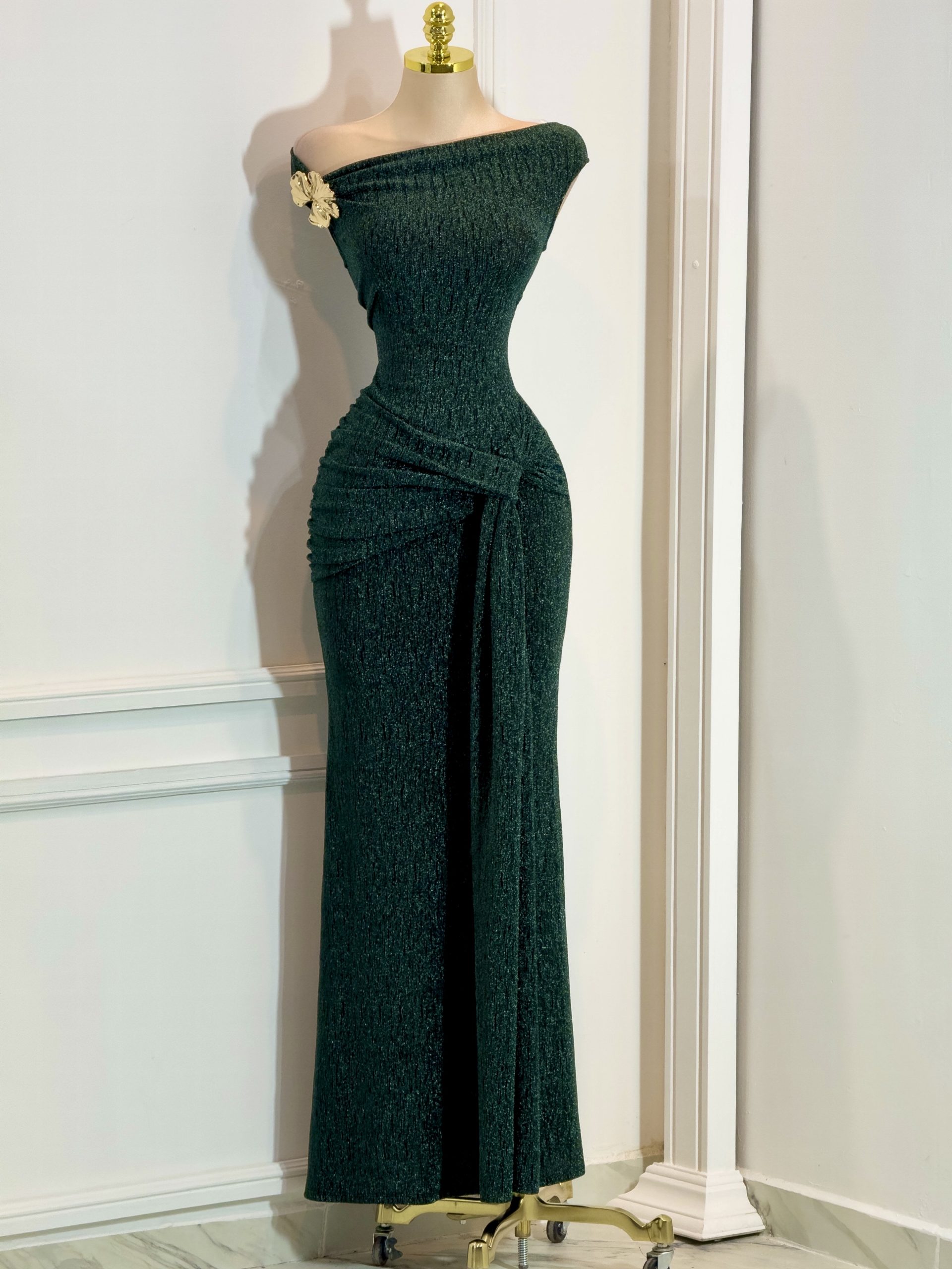 Vestido largo en tono verde con acabado brillante que aporta un toque de sofisticación. Presenta diseño de hombro caído con delicado adorno dorado que añade un acento elegante y distintivo. La silueta entallada realza la figura, mientras que el drapeado lateral con caída frontal aporta movimiento y armonía al diseño. Ideal para galas, cenas o eventos formales donde busques un look refinado, distinguido y lleno de elegancia.