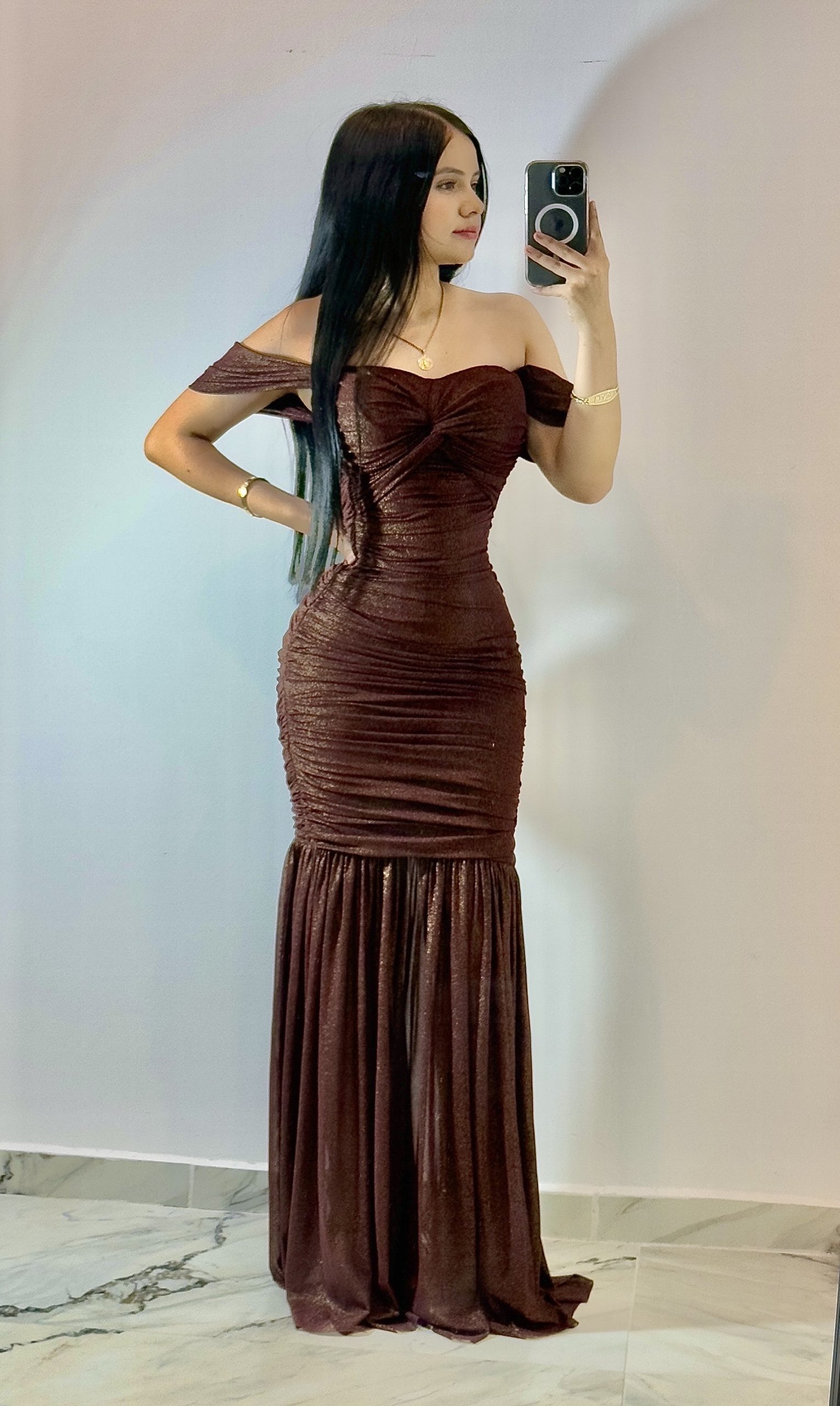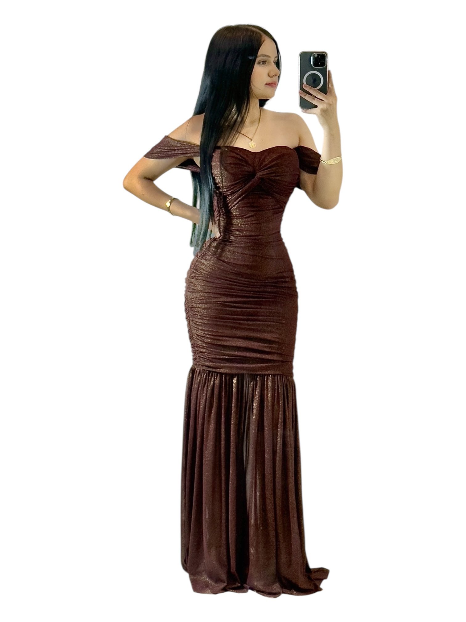 Vestido largo en tono vino confeccionado con brillo dorado que aporta un aire elegante y sofisticado. Presenta escote bardot que deja los hombros al descubierto, realzando el busto con un fruncido central sutil. La cintura ceñida moldea la silueta, mientras que la falda plisada de caída fluida otorga movimiento y ligereza. Ideal para galas, cenas o eventos formales donde busques un look glamuroso, refinado y lleno de distinción.