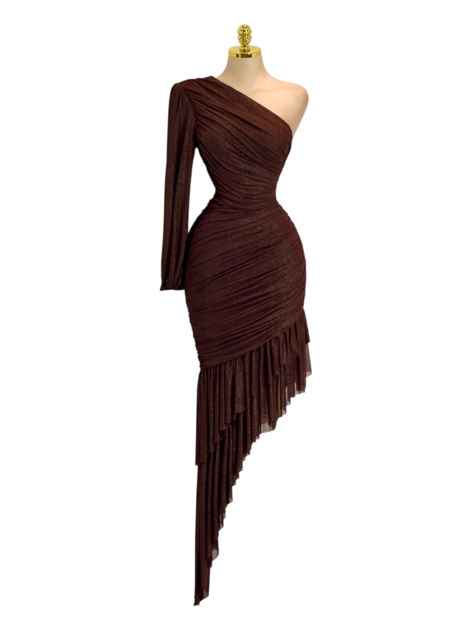 Vestido largo en tono vino con sutil brillo que aporta un acabado elegante y sofisticado. Presenta diseño asimétrico de un solo hombro con manga larga que equilibra la silueta y añade un toque moderno. El frunce distribuido a lo largo del cuerpo moldea la figura y realza las curvas, mientras que la falda con caída escalonada y corte diagonal ofrece movimiento y un efecto visual dramático y estilizado. Ideal para galas, cenas formales o eventos de noche donde busques un look distinguido, sensual y lleno de estilo.