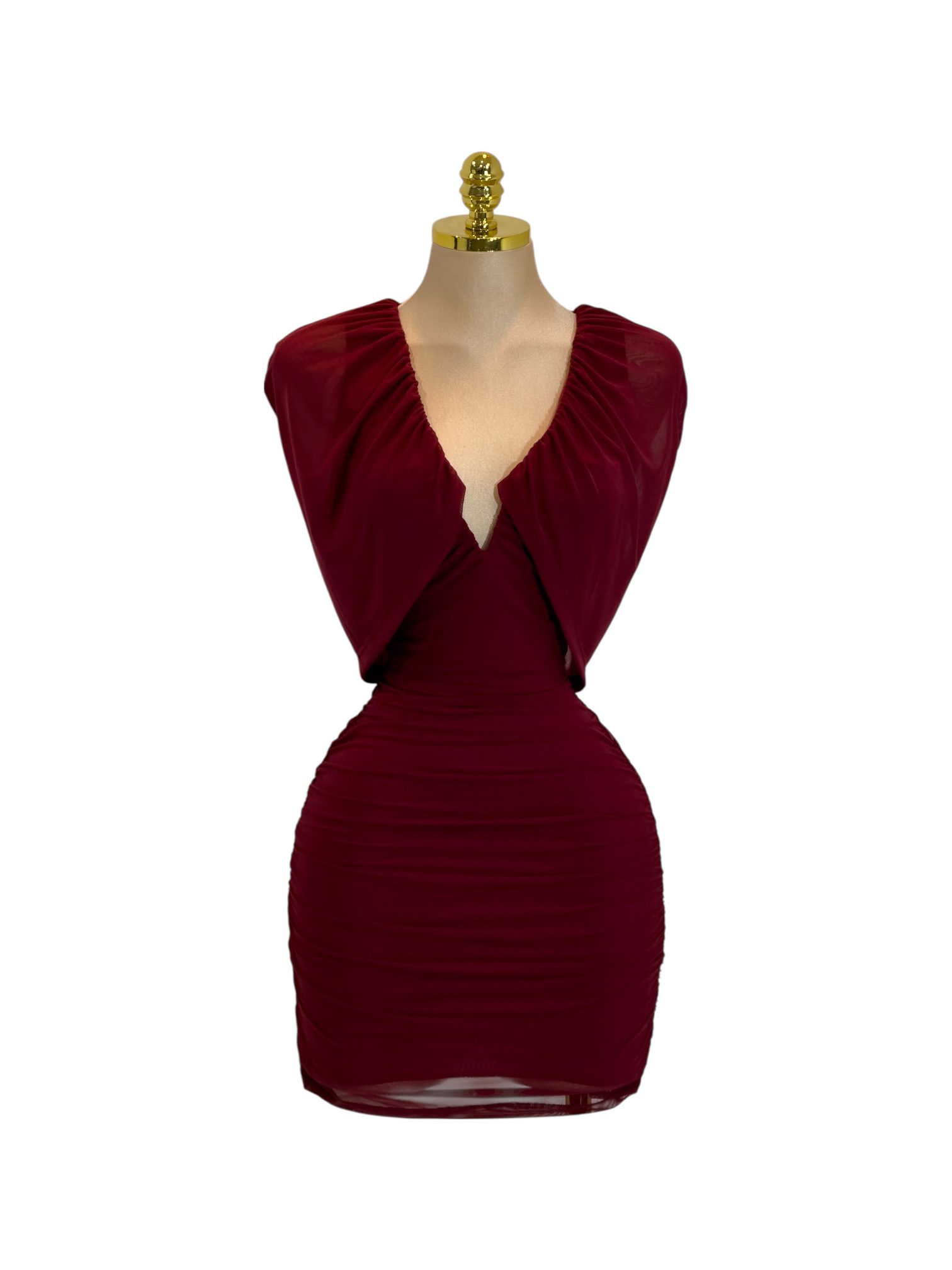 VESTIDO: CORTO COLOR VINO CON ESCOTE PROFUNDO Y FRUNCIDO