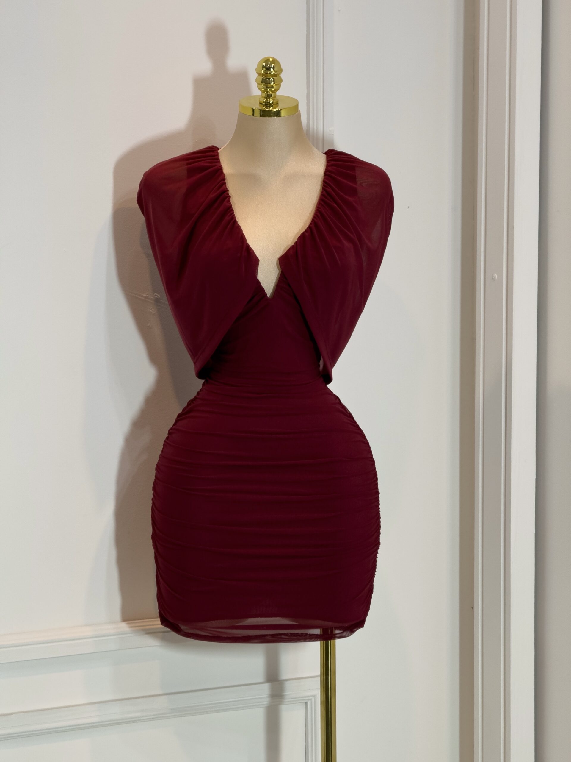 Vestido corto en elegante tono vino con diseño sensual y sofisticado. Presenta escote profundo en V con fruncido suave en la parte superior que realza el busto de forma favorecedora. El cuerpo entallado con fruncido continuo estiliza la silueta y define la cintura, mientras que la falda corta ajustada aporta un acabado moderno y femenino. Ideal para fiestas, eventos nocturnos y ocasiones especiales donde se busca un look elegante, llamativo y refinado