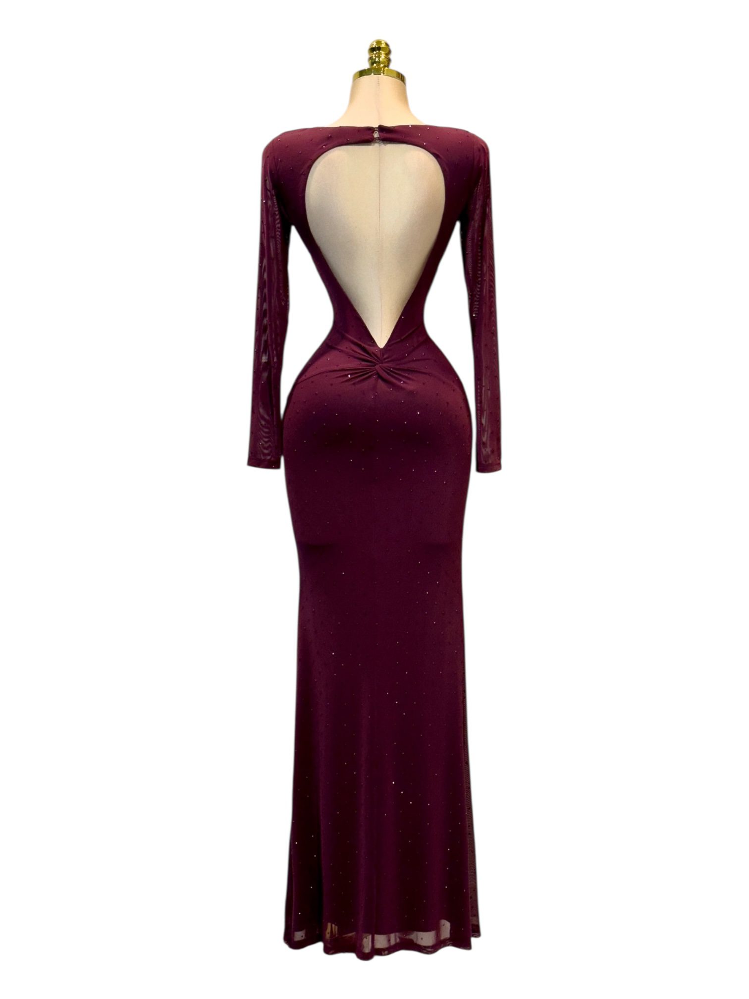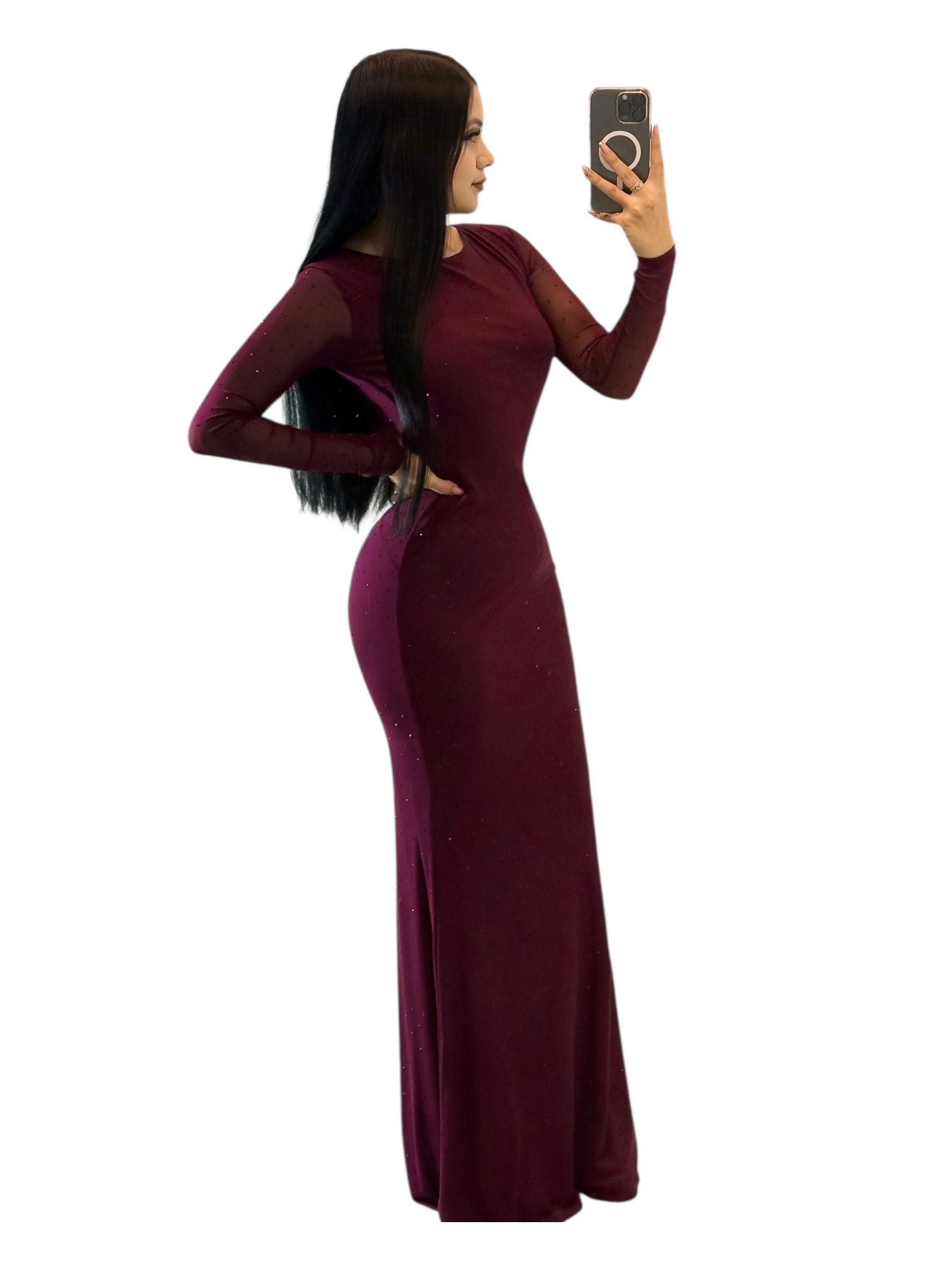 Vestido largo en tono vino con un diseño elegante y completamente ceñido que realza la figura de manera sofisticada. Presenta un escote cerrado y mangas largas confeccionadas en malla transparente decorada con piedras sutiles que aportan un toque delicado y moderno. El cuerpo entallado moldea la silueta, mientras que la falda larga de caída suave estiliza y alarga la figura. Ideal para eventos formales, cenas especiales o noches donde busques lucir un look refinado, femenino y de alto impacto visual.