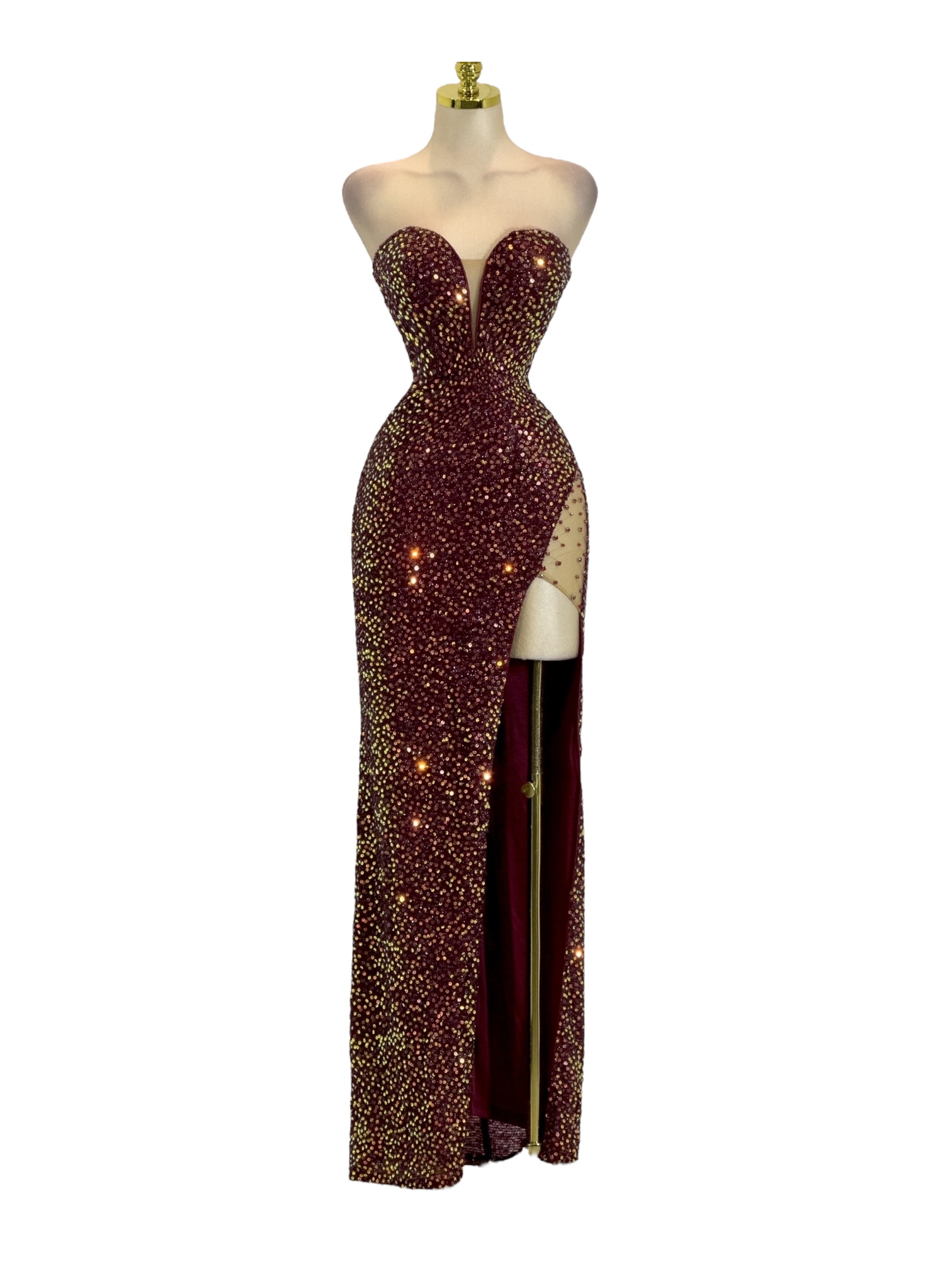 Vestido largo en tono tinto cubierto de lentejuela que crean un efecto degradado de alto impacto. Presenta escote profundo tipo corazón con estructura en el busto que realza la figura y aporta un toque sensual. La abertura lateral pronunciada en la falda añade movimiento y elegancia, mientras que el corte entallado define la silueta con sofisticación. Ideal para galas, eventos de noche o celebraciones donde busques un look glamuroso, moderno y lleno de distinción.